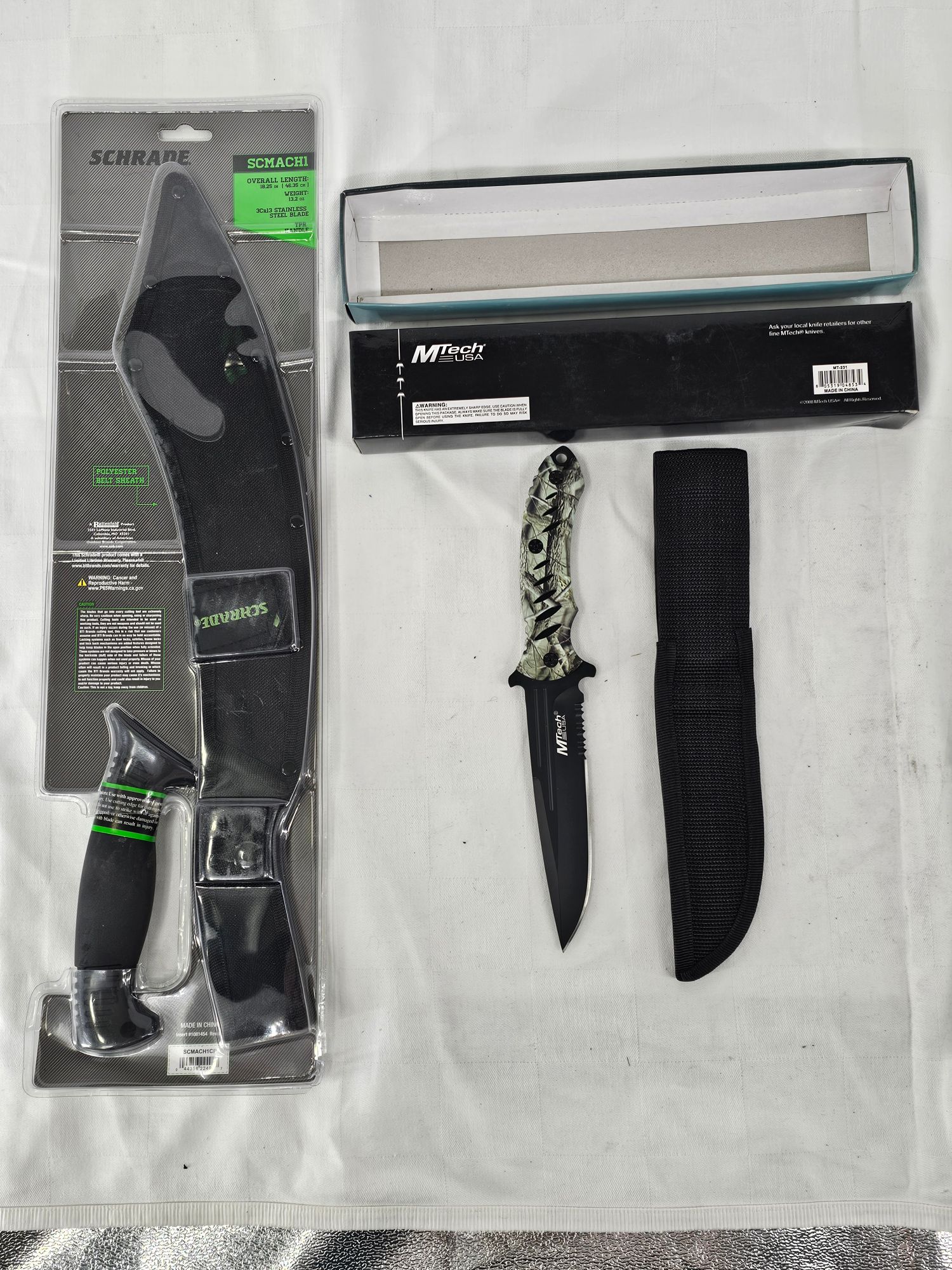 2X KNIFE LOT( NIB, SCHRADE SCHMACH1 MACHETE, MTECH 440 STAINLESS STEEL KNIFE AND SHEATH)