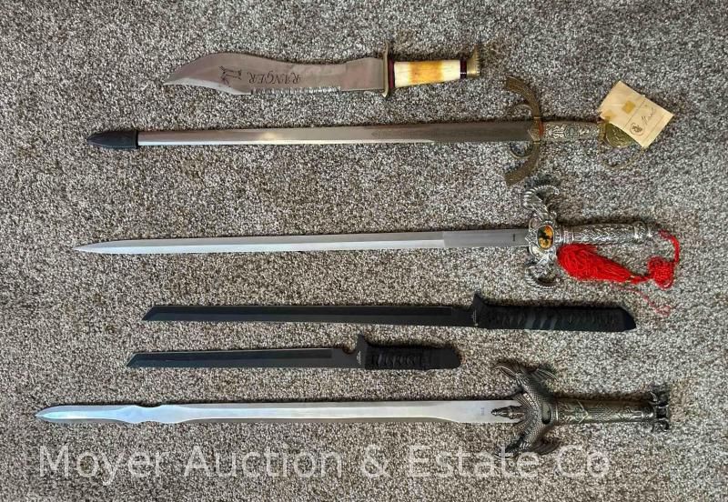 Group of Decorative Swords with Knife, 17-34" Long