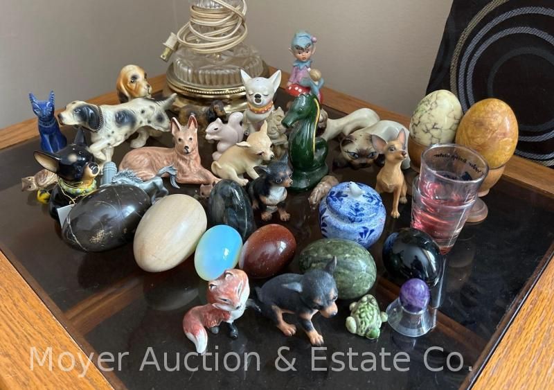 Group of Small Figurines Incl. Dogs, Marble Eggs, Cat Salt & Pepper, Etc., 1"-4"h