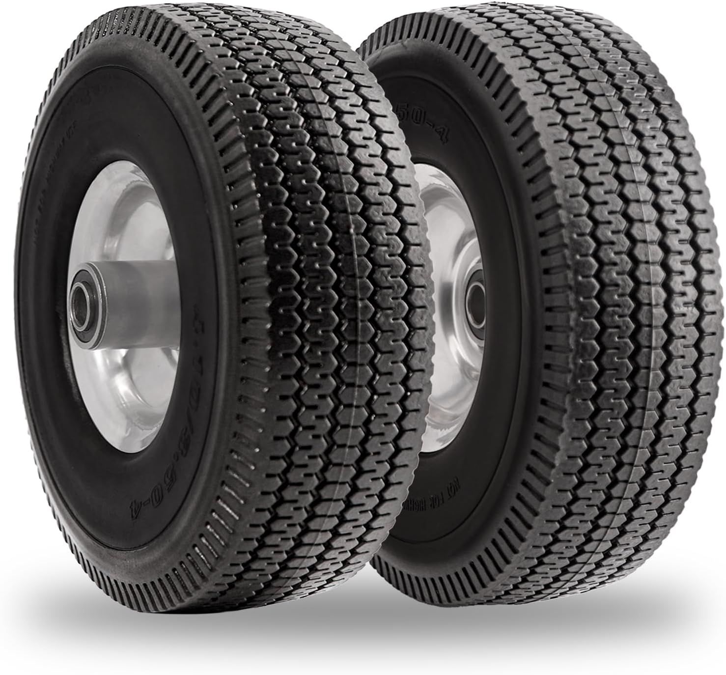 TIRE SPECIFICATION: Tire and wheel mode: 4.10/3.50-4; Tire diameter: 10 inch; Tire width: 3.15 inch; Axle bore hole diameter: 5/8-inch; Offset hub length: 2.2 inch; Rim diameter: 4.52 inch. Before purchasing, please check the tire size, hub length and axle. SOLID TIRE ADVANTAGE: The solid airless tire without inner tube, which has the features of good wear-resistance, puncture proof, no inflation, and rot resistance. Suitable for all-terrain use. No flat tire worries forever (NOT FOR HIGHWAY USE). HIGH-QUALITY MATERIAL AND ONE PIECE WELDED RIM: The solid tires are made of high-quality PU. The rims are made of premium steel and precision ball bearings. Rim are high-strength one-piece welded rim. More sturdy and more durable, ensure longer service life. APPLICABLE MODELS: The 10" solid wheels are suitable for a variety of applications such as hand truck, wheelbarrow, dolly, gorilla cart, wagon, small trailer, air compressor, yard cart, dump cart, lawn mower, utility cart, pressure washer, go kart and more.