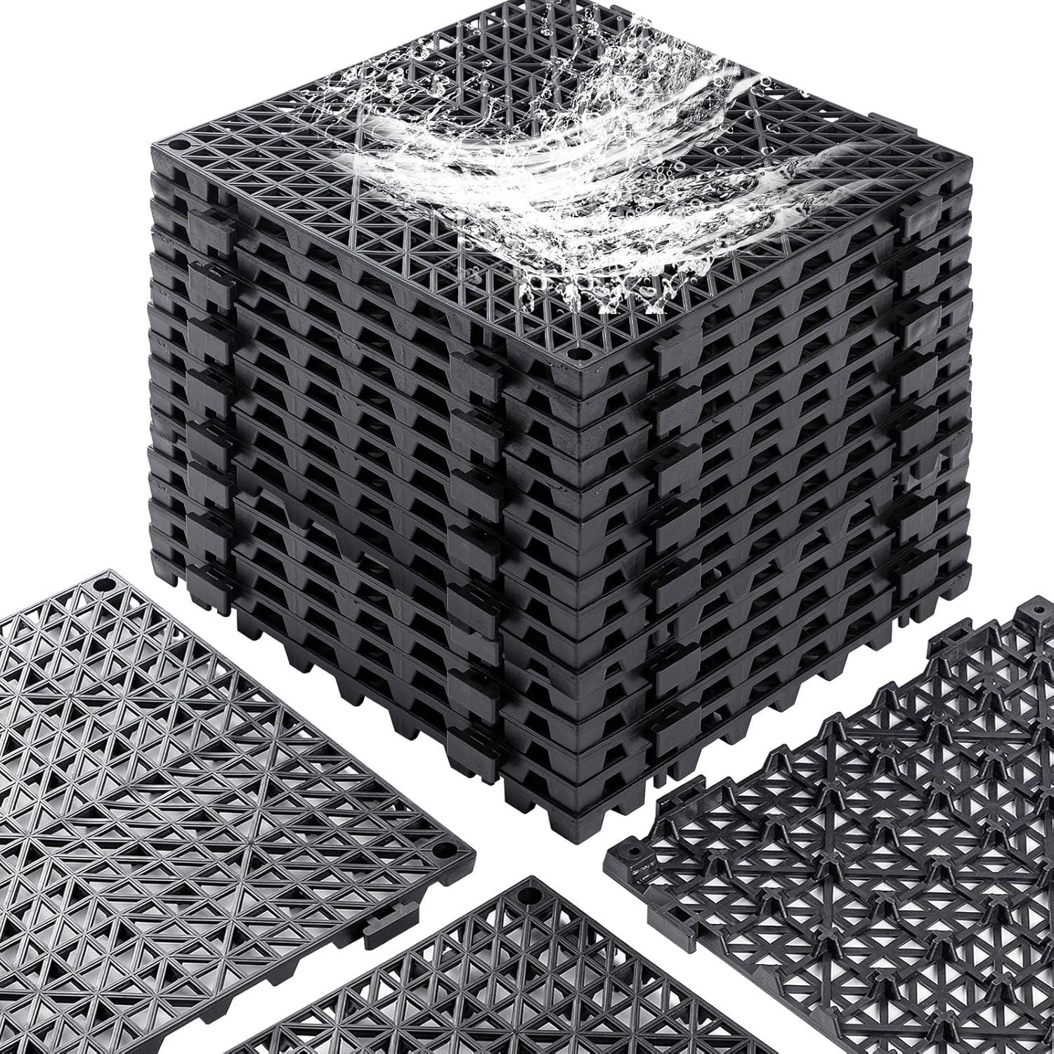 Interlocking Drainage Mats for Indoor and Outdoor Use: The non-slip floor tiles with holes have excellent drainage underneath and are ideal for damp and ventilated areas as the drainage tiles stop water from pooling and allow the floor to dry out on its own; perfect for walk-in showers, outdoor hot tub entrances and exits, pool areas such as pool slides and pool shower floors, basement and garage floors, camping doormats, or RV mattresses, and more Safe and Durable PVC Modular Drainage Tile: The pool floor drain mats are made of commercial-grade 100% recycled PVC, which is soft and flexible for comfortable footing and durability; The non-slip surface prevents slip-and-fall accidents, making it especially suitable for pregnant women, the elderly and children; Package includes 12 interlocking drain tiles, size 12" x 12" Easy to Clean and Install: Rubber tub/shower tiles have drainage holes that allow any liquid to pass through the surface; Simply hose down the floor and let dirt and debris sweep away; Installing a floor matting is as easy as a puzzle; Interlocking drain tiles have 2 adjoining male edges and 2 female edges, simply snap the tiles into place to create a beautiful surface; You can cut the PVC cushion tiles with a utility knife to meet the different needs of your floor covering Mats for Commercial Applications: Modular interlocking mats are commonly used as floor covering for concrete, wood, tiles, hot paving tiles, or travertine, which is not only aesthetically pleasing, but also allows the flooring to breathe and drain completely; Widely used as swimming pool tiles, spa area mats, locker room floors, bar mats, farmhouse mats, sidewalk flooring or boat deck floor Flooring for Residential Applications: Modular rubber mats are interlocking and perfect for installation on wet and slippery sidewalks/paving tiles; can be used extensively as bathroom floor mats, foot shower tiles, storm cellar and basement floors, door mats, shed floors, hot tub walkway tiles, outdoor swimming pools flooring, to add extra cushioning to garages, outdoor decks, RV mattresses, and for boats, balconies, dog kennels, workbenches, and sauna flooring.
