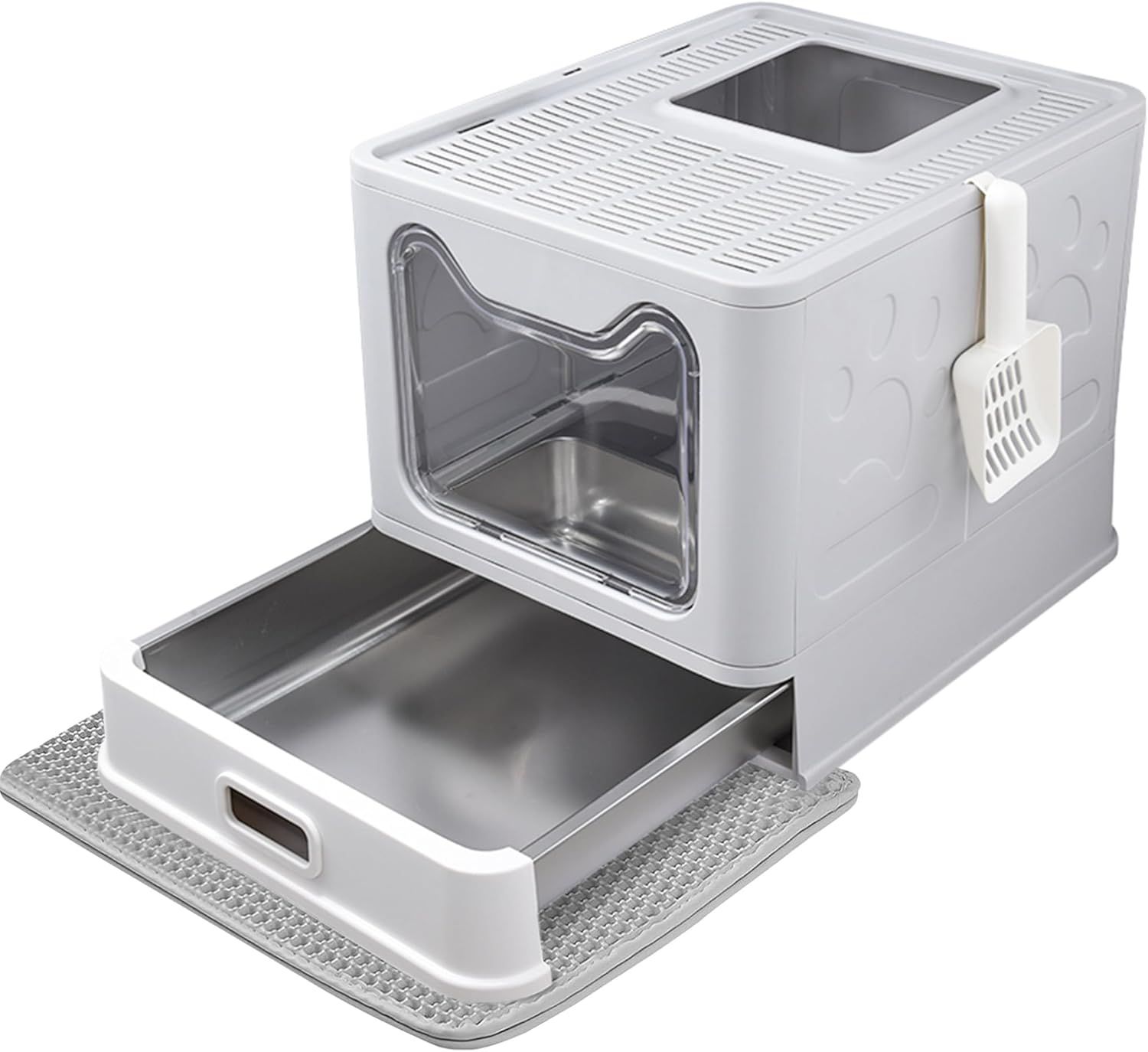 ENCLOSED STAINLESS STEEL LITTER BOX:Our enclosed litter box features a front entry and top exit design, which prevents litter from spilling out when your cat exits the litter box. If your cat doesn't like to go out the top, you can leave the front door off and put the litter mat in the front, which helps catch any litter that sticks to cat's paws, keeping the area around the box much cleaner. STAINLESS STEEL LITTER BOX WITH LID: Metal cat litter box is made of stainless steel material, which will not rust, is easy to clean, has good anti-odor effect and is long-lasting. Compared to plastic litter box, stainless steel litter boxes are less prone to wear and tear and can withstand long-term use and scratching by cats.The senior cat litter box provides a private space for the cat to prevent litter spills and also allows the cat to go in and out freely. CONVENIENT LITTER LEAKAGE: There are many small rectangular holes on the top of the enclosed cat litter box, when your cat jumps out of the litter box, these holes can filter the litter from the cat's claws. The filtered litter falls back into the litter box through the small holes and won't get all over the floor, greatly reducing your cleaning hassle. FOLDABLE LITTER BOX: The best portable medium square litter boxes for indoor and travel cats adopts a safety buckle articulation, easy to install and remove, which allows the top and bottom of the small cat litter box to fit snugly together by simply pressing up and down,effectively preventing the cat deodorizer for litter box and urine from leaking out. The bottom of the covered litter box can be freely slide, which brings you great convenience in cleaning the litter box. KITTEN LITTER BOX SET: Our set includes a stainless steel kitten litter box, a gray cat mat for litter box and a teaser stick. The extremely low entrance of our litter box ensures that elderly or short-legged cats can easily access the covered cat litter box, making it stress-free for your feline friend to defecate.