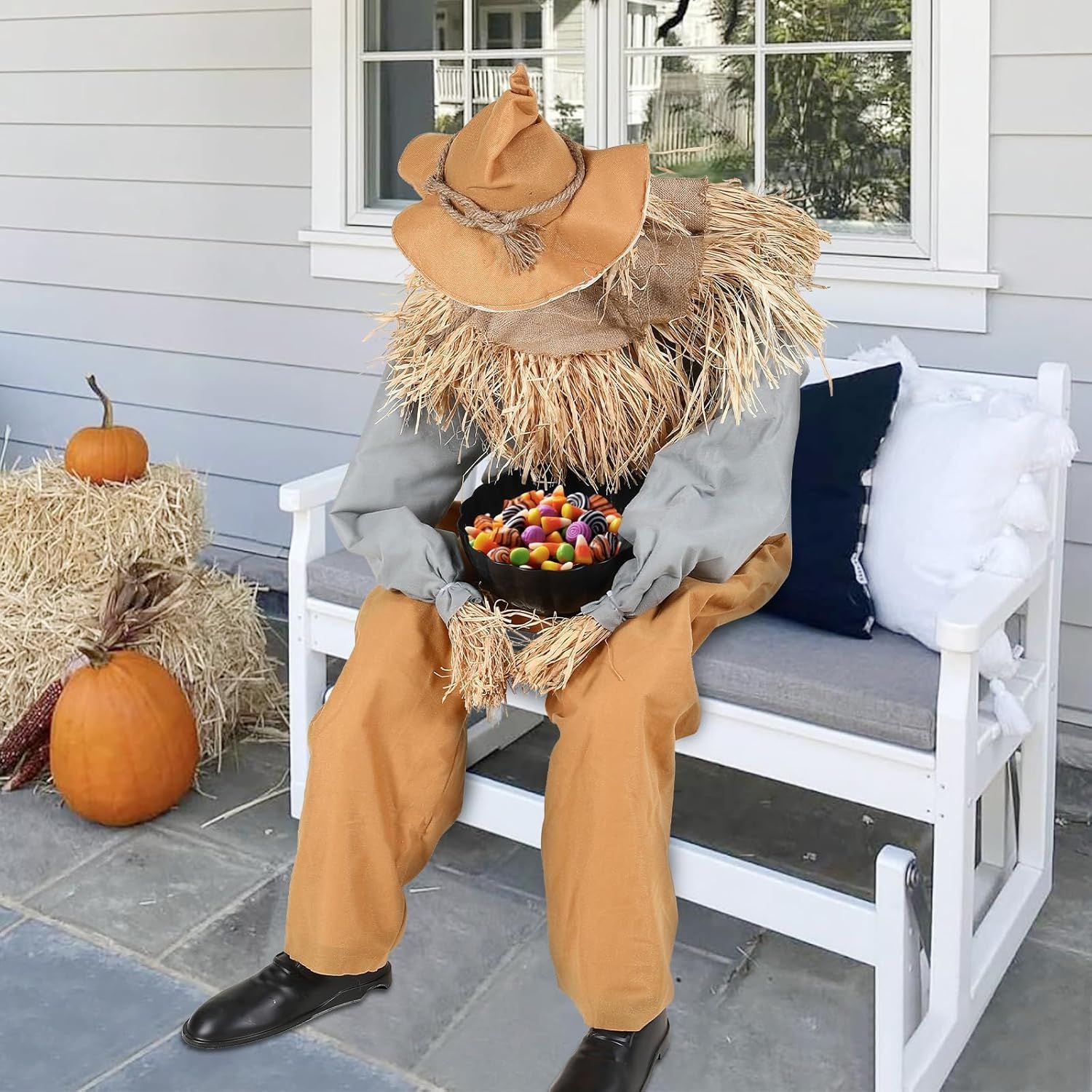 Scary Sitting Scarecrow--When someone reaches for the candy of bowl, its head jolts up, red eyes flash, and it lets out a spine-chilling AHH! followed by eerie, maniacal laughter Hahaha! A perfect animatronic jump scare for your haunted house or Halloween night! Unique Design--This sitting scarecrow features a detailed face, rustic outfit, and a large bowl for treats, making it both a spooky prop and a functional candy holder. Halloween Scary Surprise--Perfect for surprising trick-or-treaters and creating unforgettable Halloween moments on your porch, in your yard, or at parties. Easy Assembly--Just follow the included instruction manual no tools or technical knowledge needed. You ll have it ready to use in minutes! Battery Powered--Requires 4 AA batteries (not included) perfect for porches, tabletops, chairs, or haunted house scenes.