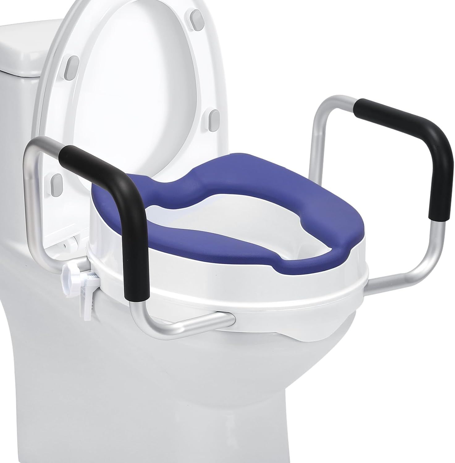 More comfortable: The toilet seat with handles is padded with TPR blue for ultimate comfort, ensuring a secure fit while also providing a pleasant user experience. There is no need to remove the toilet cover when using it. Just put it on the toilet and fix it when you need it. EASY TO CLEAN: Designed with a PP base, this toilet seat riser allows for effortless cleaning. The front grooves are easy to clean, prioritizing hygiene. DURABLE MATERIAL: Constructed with rust-resistant aluminum pipes, our handicap toilet seat riser ensures long-lasting durability, making it a reliable choice for daily use in any bathroom environment. PERSONALIZED CUSTOMIZATION: With two width adjustment settings (19'-21') and the ability to raise the seat up to 4 inches, this raised toilet seat with arms is ideal for users of varying heights, providing optimal support and comfort tailored to individual needs. HOW TO USE: Make sure the front protrusion of the toilet riser is clipped into the front of the toilet, and then the clips on both sides of the toilet riser lock onto the toilet. The adjustable handles ensure stability, making it perfect for the elderly, disabled, or those with limited mobility after surgery.