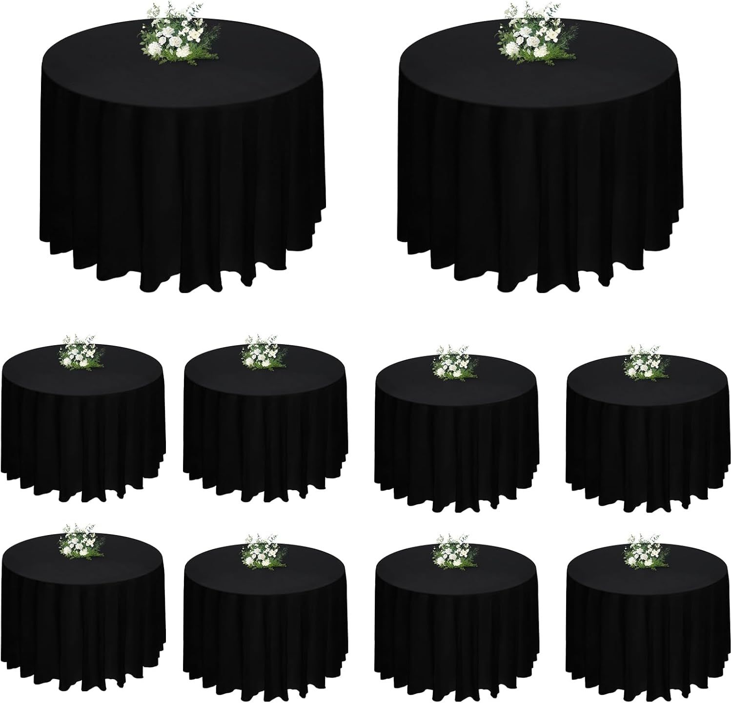 Perfect Fit for Specific Table Sizes 70 inch (5.8 ft) covers 48-54 inch (4-4.5 ft) tables; 90 inch (7.5 ft) fits 60-66 inch (5-5.5 ft) tables; 108 inch (9 ft) suits 72-78 inch (6-6.5 ft) tables; 120 inch (10 ft) covers 84-90 inch (7-7.5 ft) tables; 132 inch (11 ft) fits 96-120 inch (8-10 ft) tables. Ideal for all sizes of Mesas Redondas. Premium Polyester Fabric (Tela) Lightweight yet durable with a smooth texture that adds elegance. This high-quality Tela resists wear from frequent use, ideal for daily meals and special events like fiestas. Classic Black & White Design Timeless colors complement any decor, elevating table setups for weddings, parties, or banquets. Sleek Negro and crisp Blanco pair perfectly with manteles elegantes. Easy Care & Reusable Machine washable in cold water (gentle cycle), tumble dry low, or iron on low heat. Resists fading and shrinking, ensuring your mantel de mesa stays in great condition. Indoor & Outdoor Versatility Suitable for dining rooms, kitchens, wedding venues, and outdoor events. This durable Mantel Redondo handles spills and light outdoor elements, perfect for mesas de cocina or banquetes.