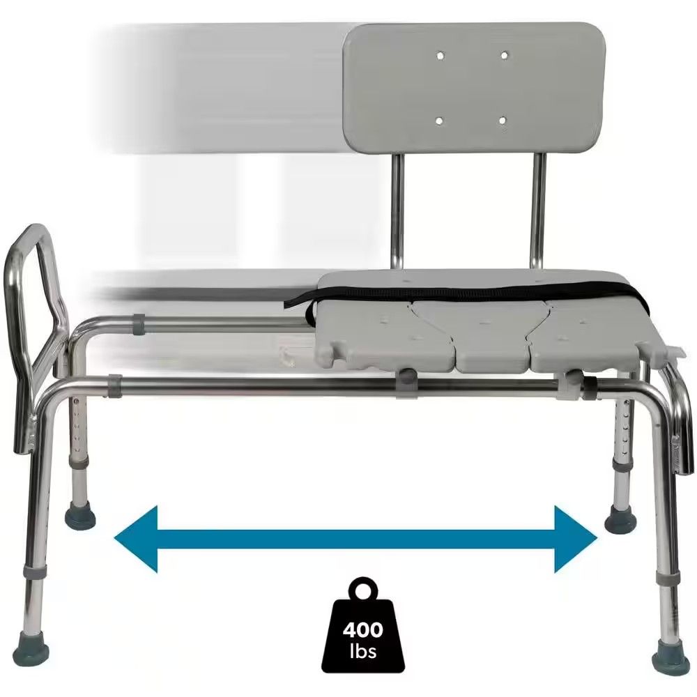 This best-selling sliding transfer bench will provide welcome relief and increased independence for those who have trouble getting in and out of the shower, standing for prolonged periods or worries about falling. You can shower with confidence knowing you have a stable platform to sit on! Position one end of the bench outside the shower and the other end inside, making sure the legs are stable. Sit on the seat and easily slide across into the shower. Caregivers will find it especially helpful in transferring people using wheelchairs or walkers with this back-saving aid. Durable, lightweight aluminum frame offers sturdy support. Cut-out easily removes for perineal access. Adjustable legs with suction-cup, slip-resistant tips for stability. Nylon strap locks and holds seat in place to provide additional safety. Seat height adjusts from 19 in. to 23 in. in 1 in. increments. Seat width: 19 in. seat depth: 15 in. Slip-resistant tips keep legs securely in place. Width (in.): 19. Features: Chair Back. Weight Capacity (lb.): 400. Material: Plastic.