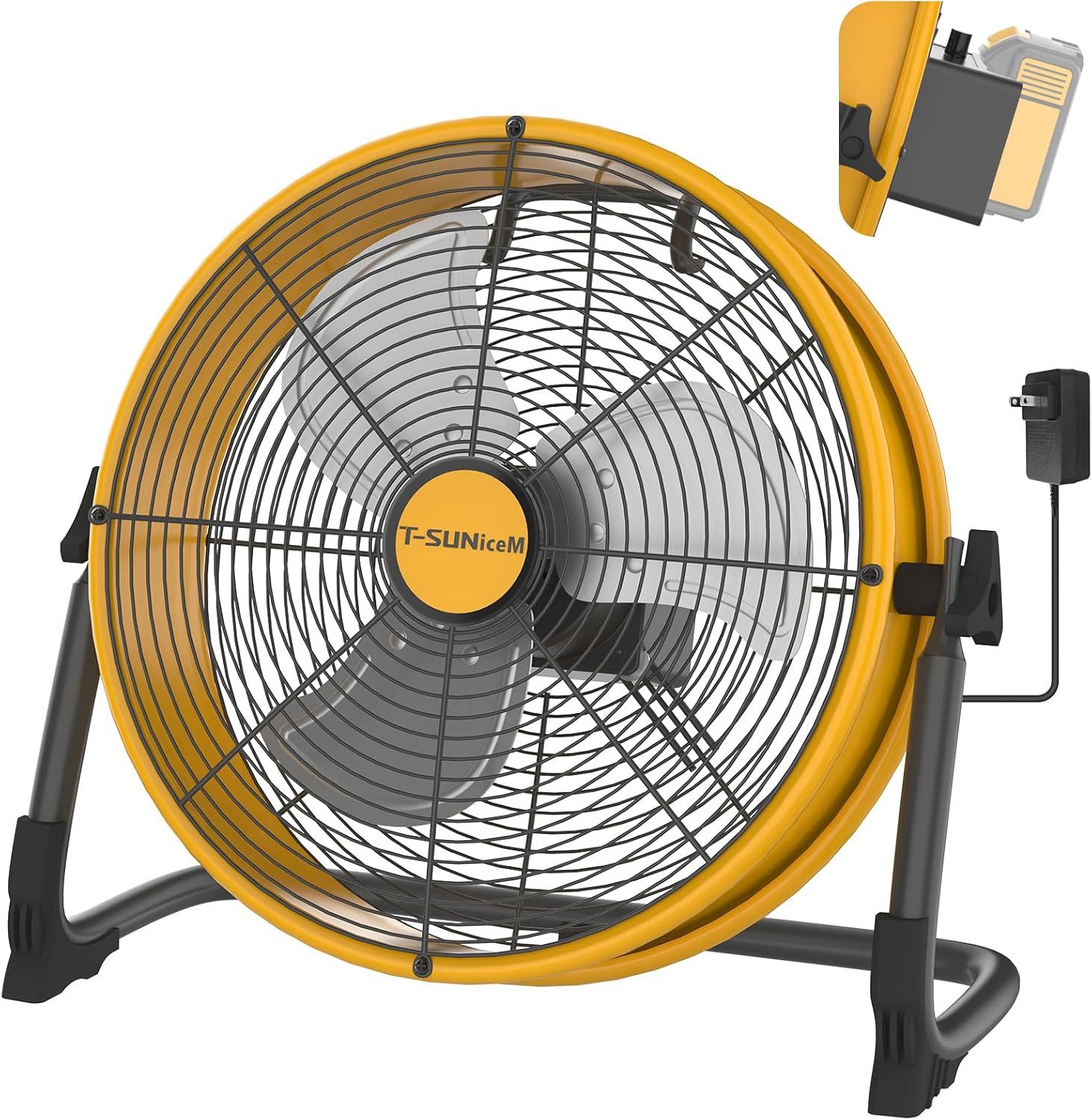 DUAL POWER OPTIONS T-SUNiceM battery powered fan compatible with Dewalt 18V 20V Lithium ion Batteries or AC adapter power supply. Compatible with Dewalt 20v max batteries DCB206 DCB205 DCB204 DCB181 DCB182 DCB200 DCB203 DCB205-2 DCB204-2 DCB206-2 and more. Reuse your existing batteries, eliminate the need for separate cooling equipment batteries (batteries and charger not included) JOBSITE & OUTDOOR TOUGH Battery fan 16 inch high-velocity airflow, air volume of up to 2500CFM cools workshops, camping tents, or power outages. Features ultra-efficient brushless motor and heavy-duty metal blades for powerful yet quiet operation ( 35db). Full 360 adjustability direct high-speed airflow up and down. ULTRA-LONG RUNTIME & PRECISION SPEED CONTROL Tailor your cooling with stepless speed adjustment, providing precise airflow customization to meet your preferences. On low speed with a 4Ah battery, enjoy 30+ hours of nonstop cooling. Perfect for full work shifts or multi-day camping trips. Additionally, the large battery powered fan built-in USB and Type-C dual port allows you to charge your devices simultaneously, maximizing convenience and functionality. 4 LED indicators on the battery pack display exact battery power levels. DURABLE AND WATER-RESISTANT Built to withstand the rigors of everyday use, cordless fans portable rechargeable features a sturdy metal frame and blades for enhanced durability, Its IPX4 water-resistant rating offers peace of mind for outdoor use in various weather conditions, making it a dependable companion wherever you go. OUT-OF-BOX JOBSITE FAN No assembly is need. Both the anti-slip feet and carrying handle have already been equipped before you receive this construction fan. Easy for you to figure out this is camping fan when you're on-the-go in outdoor activities. WIDE APPLICATIONS Compact size will not take up much space, no matter where you are, it can meet your needs at any time. Perfect companion for working, travel, picnics, BBQs, fishing, camping, trip, beach, outdoor parties, hot sporting events and hiking! Summer coming up, so this outdoor fan will be put in good use!