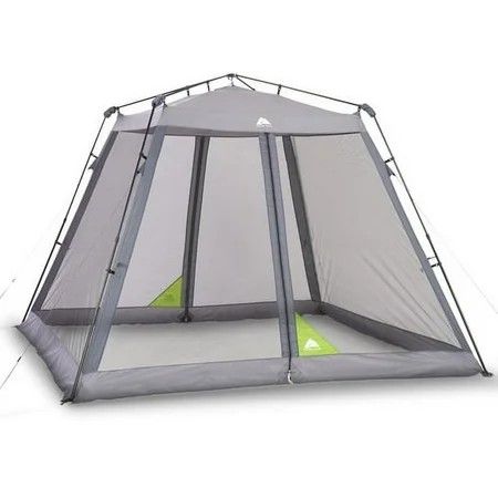 Easy 60-second setup Heavy-duty mesh keeps the bugs away 10' x 10' instant canopy includes a pre-attached steel frame 2 doors for easy access 50+ UV protection Includes carry bag Includes 10 steel stakes and tie downs Instant screen house has height of 7' in center Made of polyester and steel.