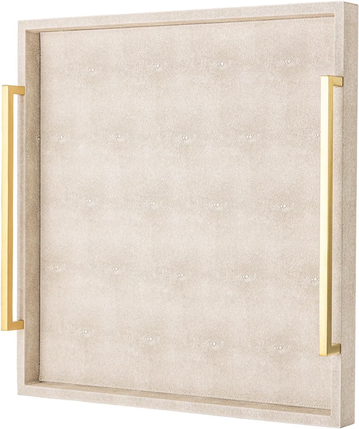Elevate your living space with our stunning large ottoman tray for coffee table. The square design and elegant brushed gold handles add sophistication and style to any room. This large decorative tray crafted from 12mm thick medium density fiberboard and covered in durable Shagreen leather, this is not only stylish but also incredibly sturdy, ensuring long-lasting use. This large serving tray with sturdy brushed gold handles provide a comfortable and secure grip, making it easy to transport and serve food and drinks with ease. Versatile and stylish, this serving tray is a perfect addition to any room in your home whether it be the living room, kitchen, bedroom, or bathroom. It adds a touch of elegance wherever it is placed. Invest in this exquisite ottoman tray to enhance your home decor and impress your guests.