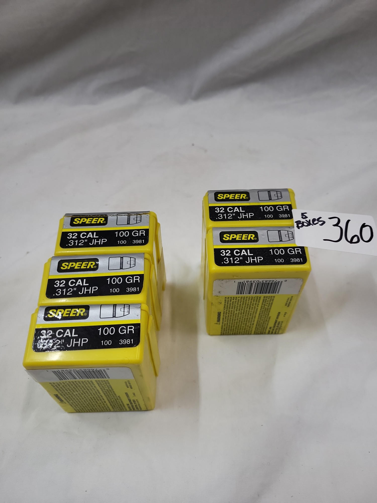 This lot includes five boxes of SPEER .32 Cal .312" JHP 100 GR bullets, each containing 100 bullets.