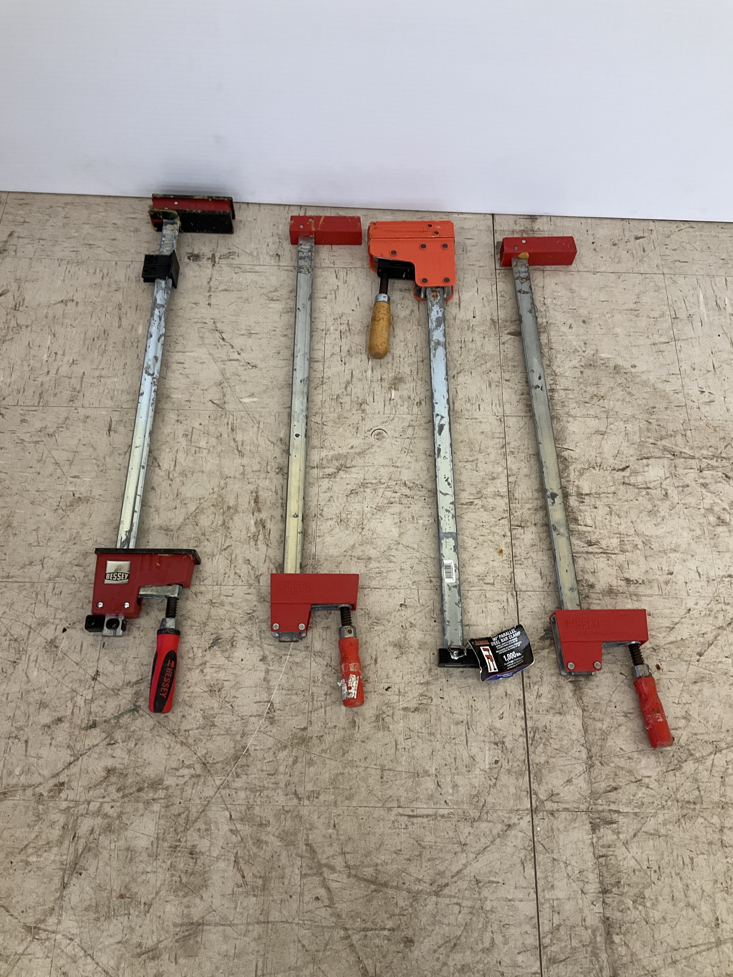 Lot of four parallel steel bar clamps, including Bessey and Jorgensen brands. One Jorgensen clamp is rated for 1,000 lbs of clamping pressure. 32 in.