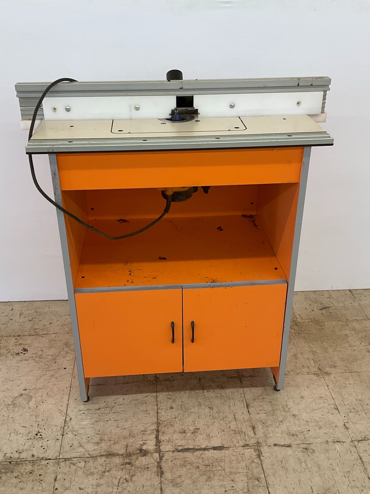 This listing includes a Triton TRA001 1/2" Precision Router mounted in a sturdy router table. The table features a cabinet base with doors for storage. Also included are a variety of accessories for the router, including guide bushings, wrenches, and a manual.