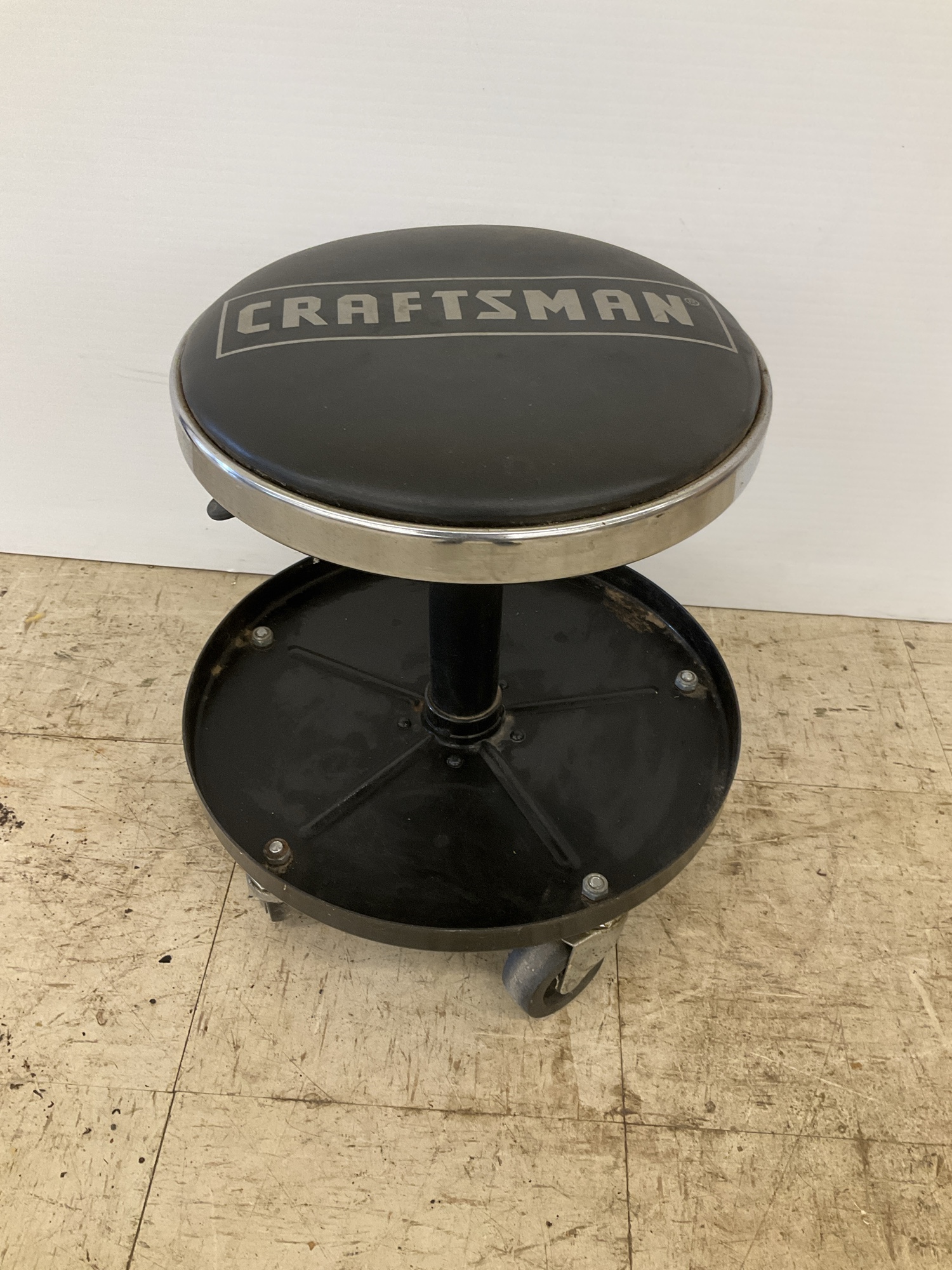 This is a rolling shop stool with a round, padded seat. The seat has the Craftsman logo on it. It also features a lower shelf and smooth-rolling casters. 14 in. tall
