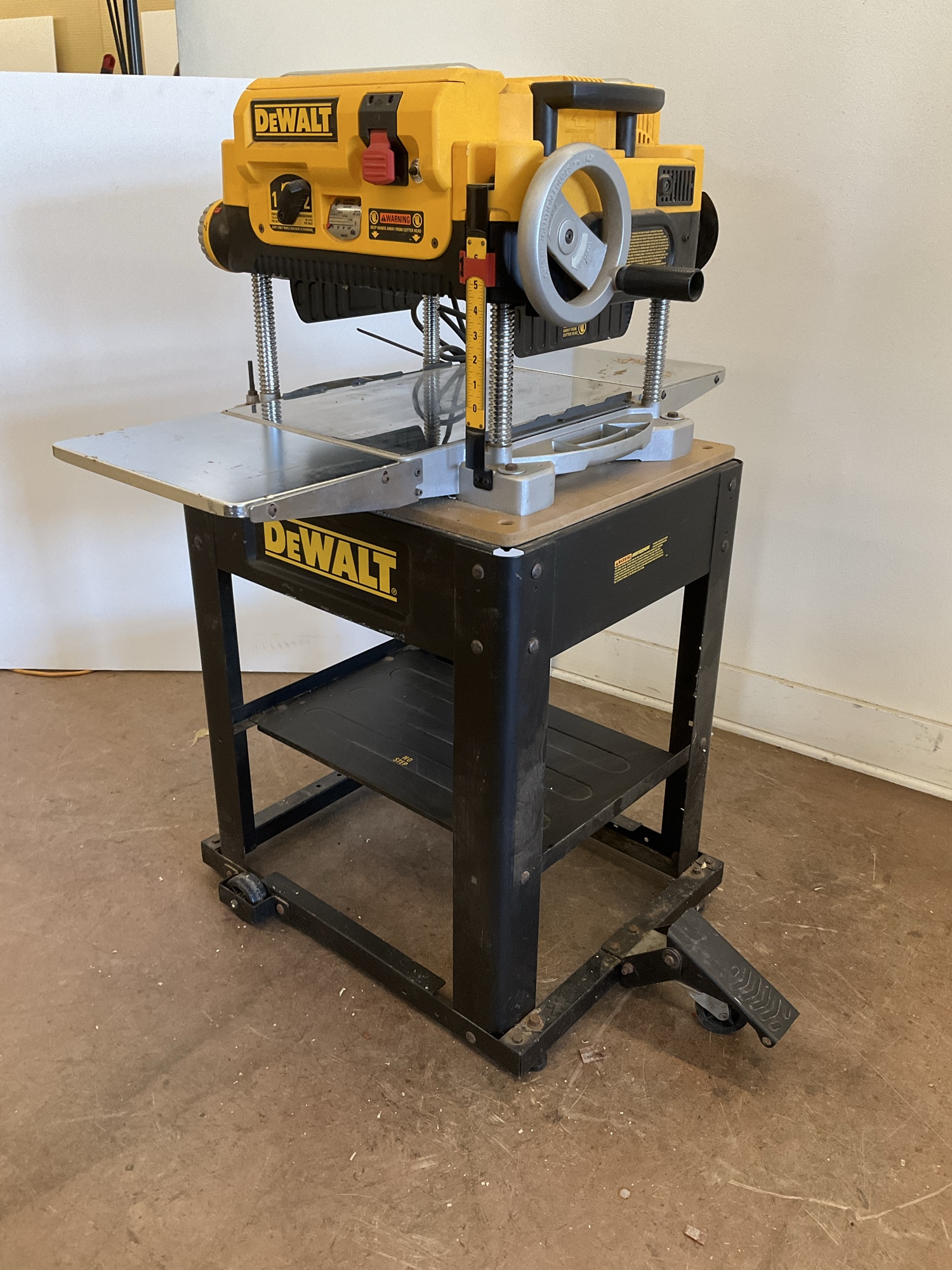 This listing is for a DeWalt DW735 13" Thickness Planer, equipped with its original stand. The planer is capable of handling material up to 13" wide. The unit is fully functional and ready for use.