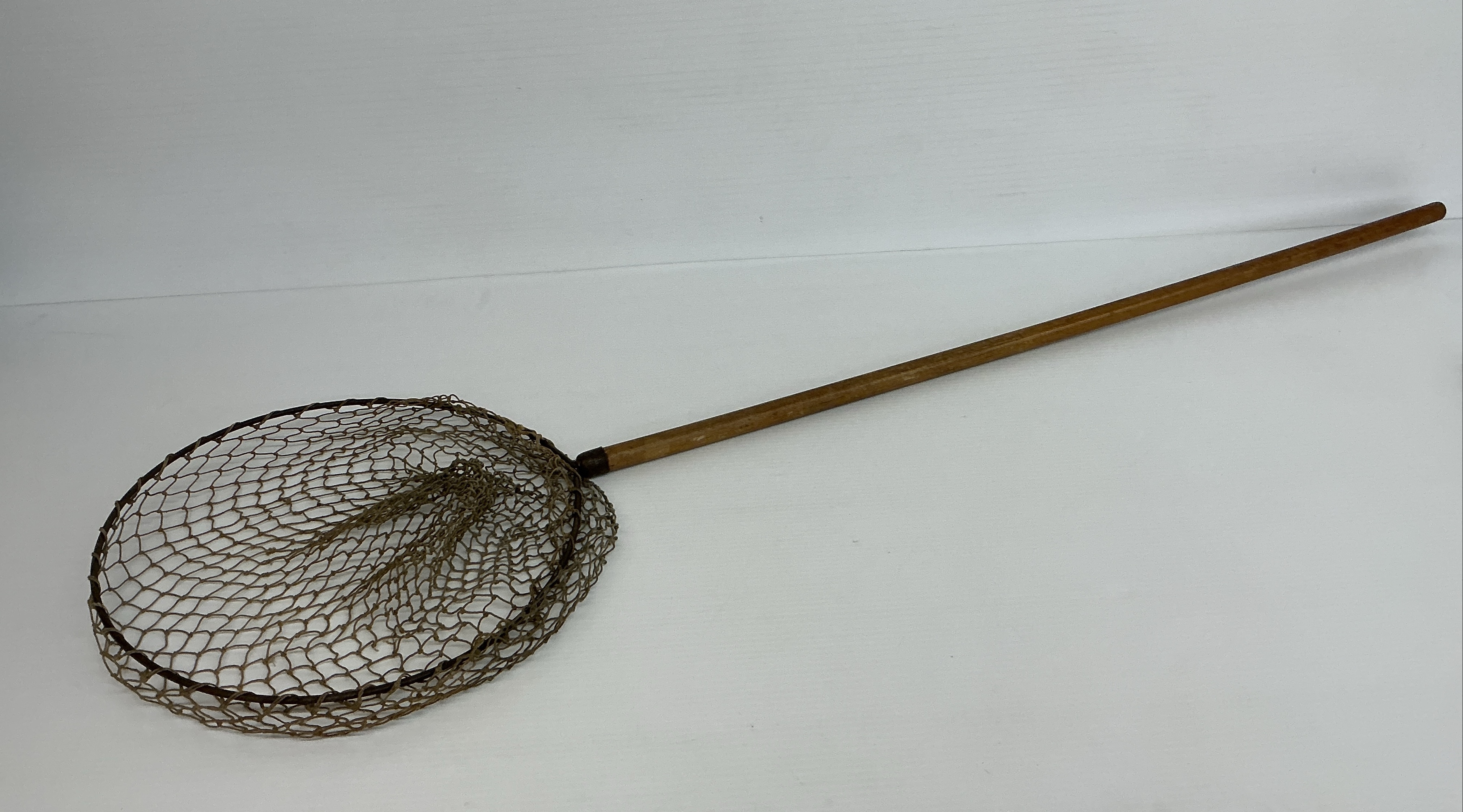 A long-handled net with a wooden handle and large net head. Appears to be for fishing or similar activities. 58 in. long