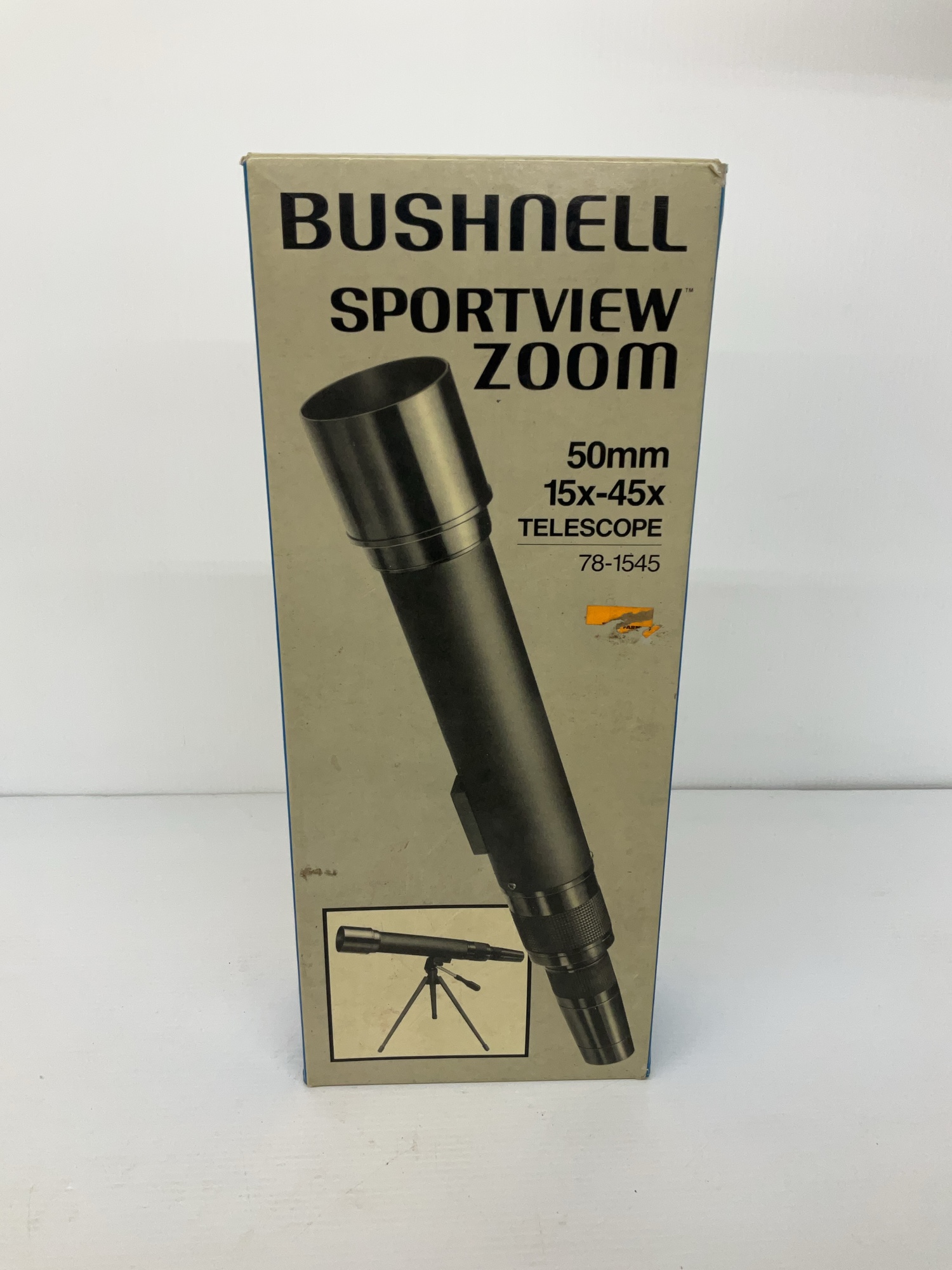 This auction is for a Bushnell Sportview Zoom telescope, model 78-1545. It features a 50mm lens and zoom capabilities from 15x to 45x. Includes the original box and a tripod.