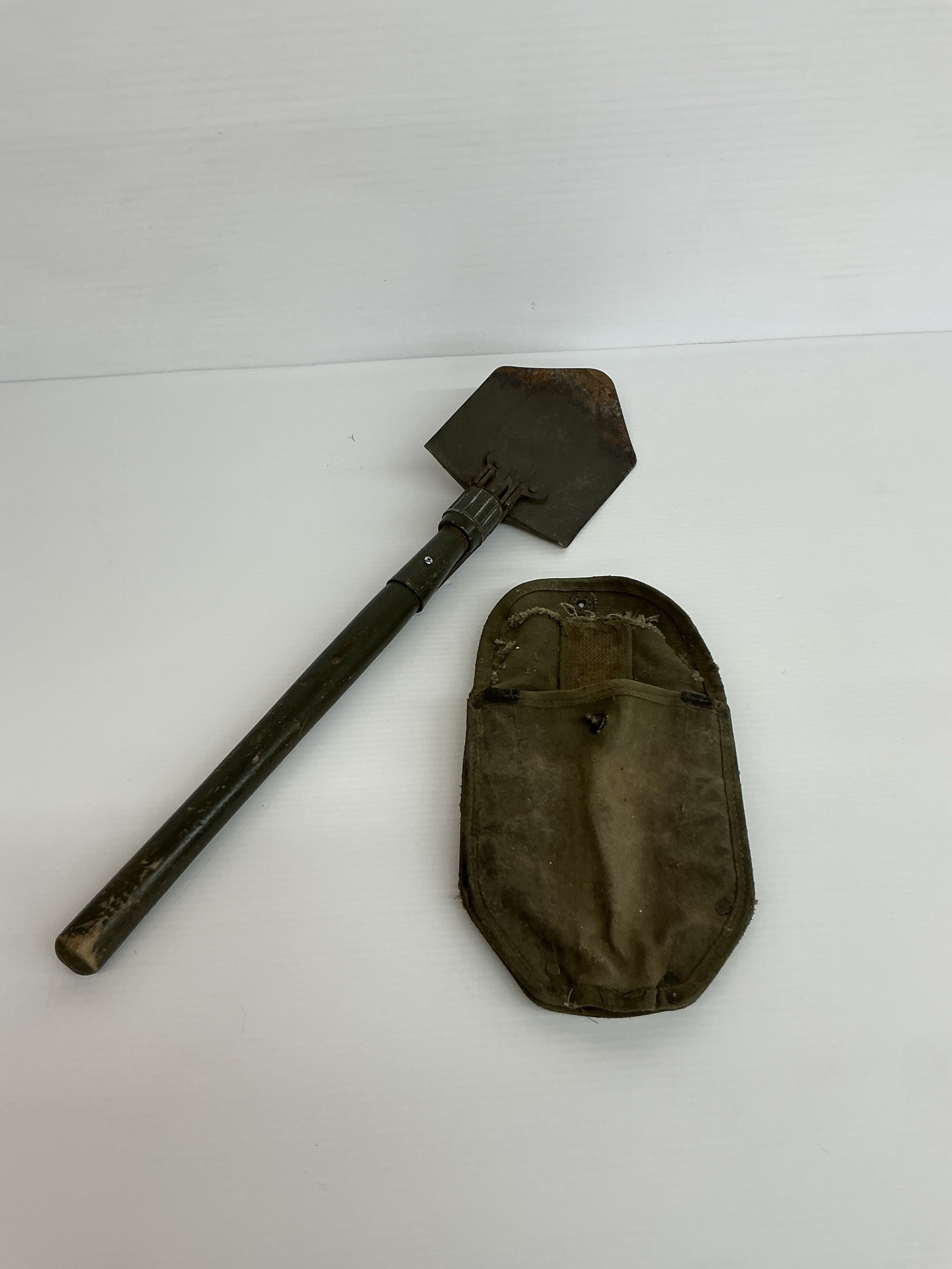 This listing features a military folding shovel and its carrying case. The shovel is olive drab and includes a metal folding mechanism and a wooden handle. The carrying case is canvas and has a snap closure.