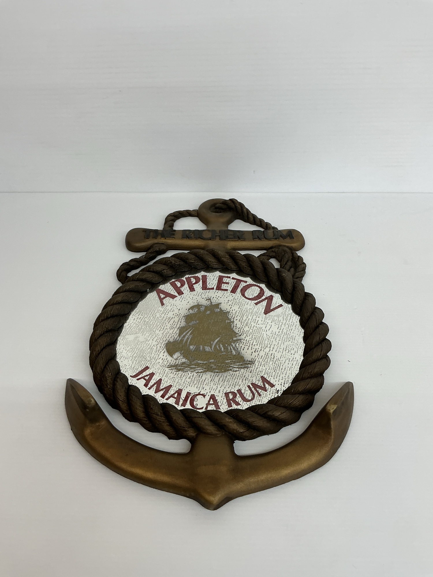 Appleton Jamaica Rum anchor shaped sign with "The Richer Rum" text at the top. The sign is surrounded by a rope design and features a sailing ship graphic. 26 x 17 in.