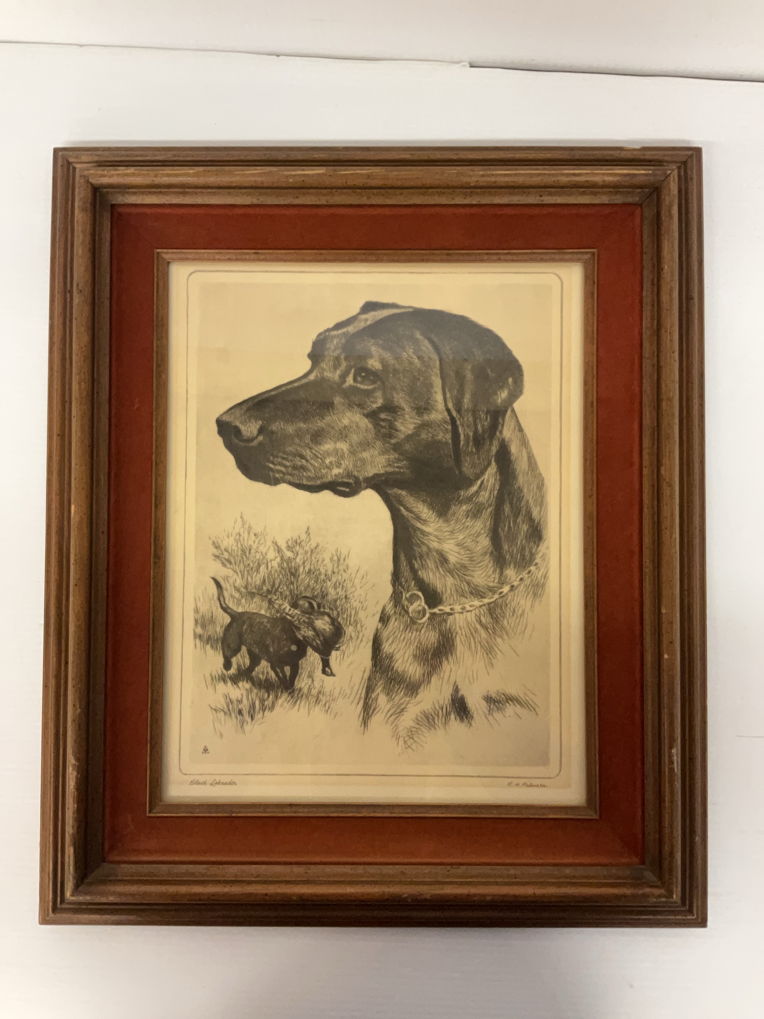 Framed print titled 'Black Labrador' by R.H. Palenske. Features a profile of a dog in the foreground and two smaller dogs in the background. The print is framed in a wooden frame with a red inner border.