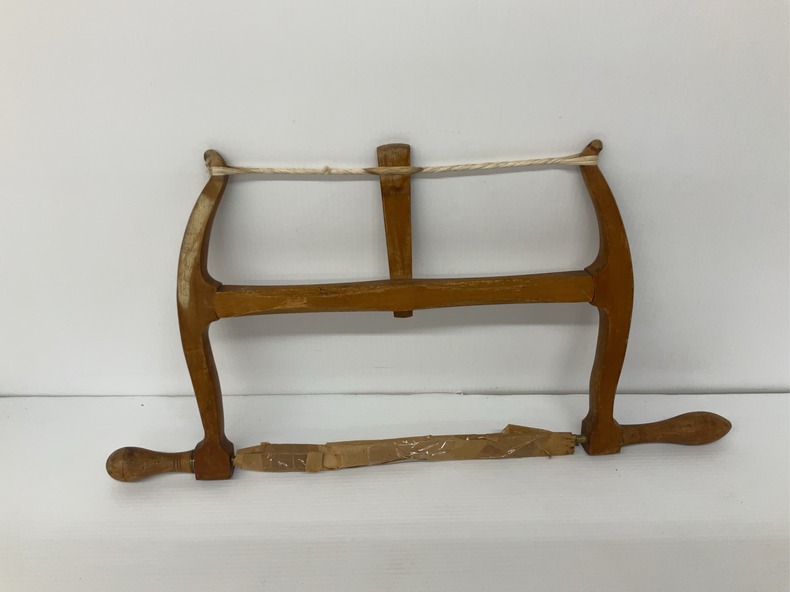 A hand-crafted wooden bow saw. This unique tool features a curved frame, string tensioner, and turned wood handles. Perfect for woodworking.