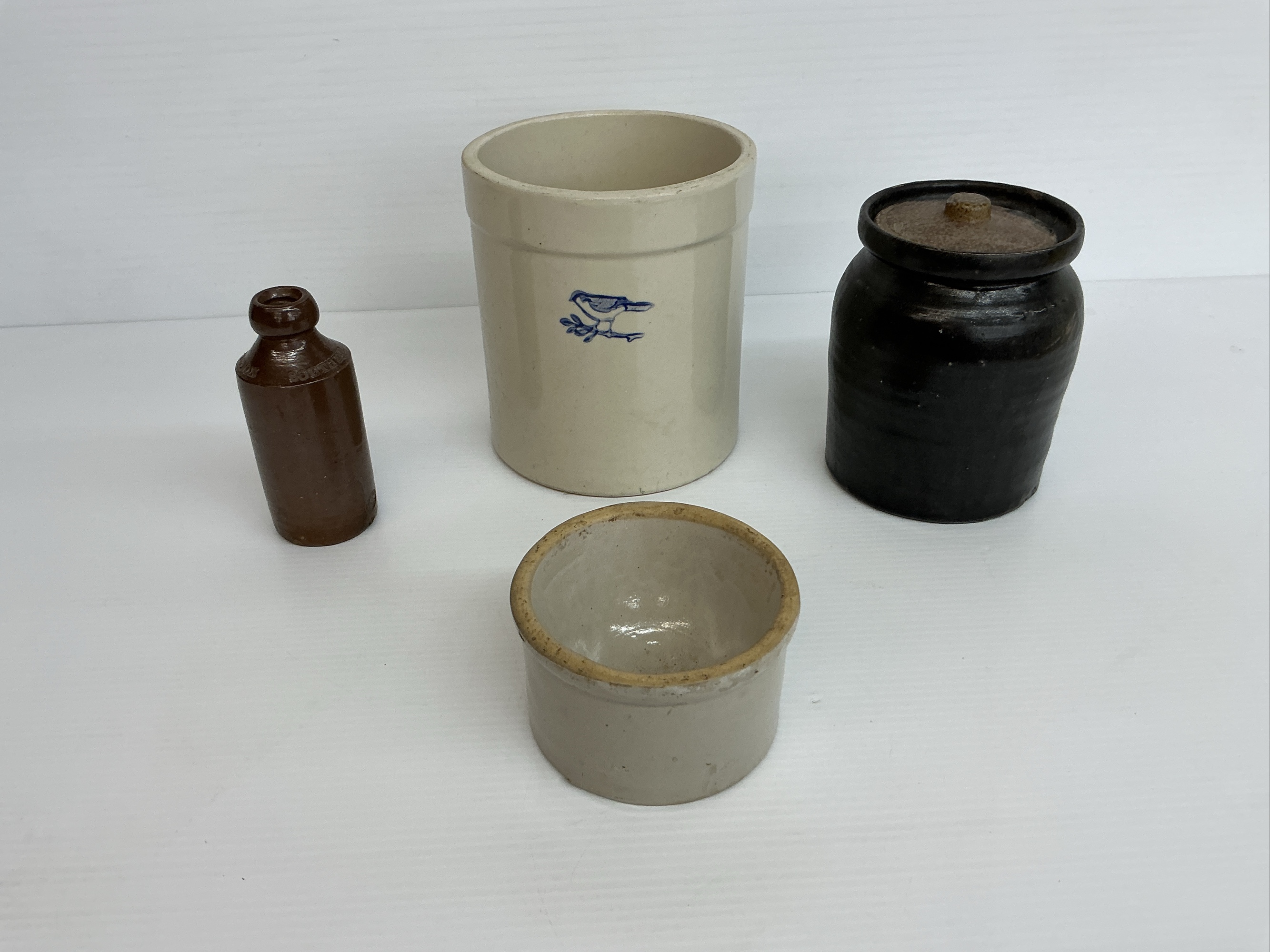 This collection includes a variety of stoneware and clay items. There is a Burley Clay USA product, a crock with a bird design, a jar with a lid, and a brown bottle embossed with 'Harrington Southern'. Tallest 8 in.