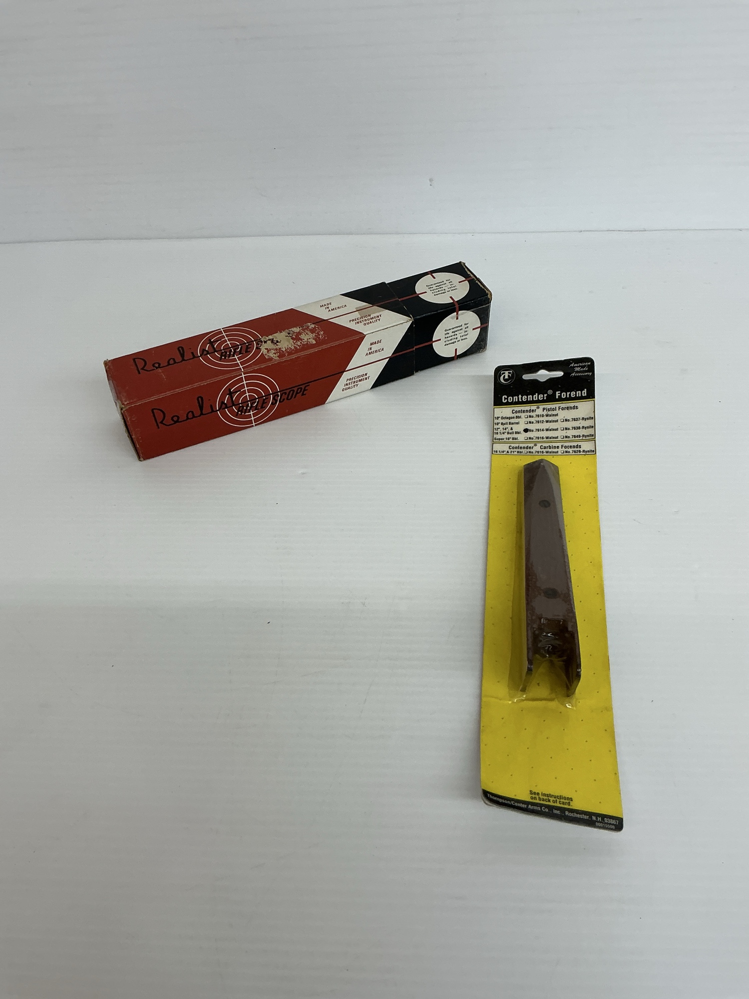Includes a Realist scope and a Contender forend. The Contender forend is compatible with various Contender models, including pistol and carbine versions.