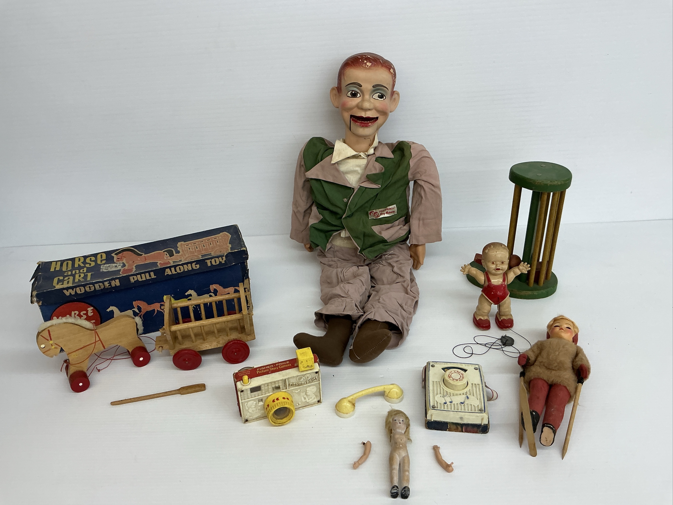 This lot includes a variety of dolls, including a ventriloquist dummy, and toys such as a wooden pull toy, Fisher Price picture story camera and radio.