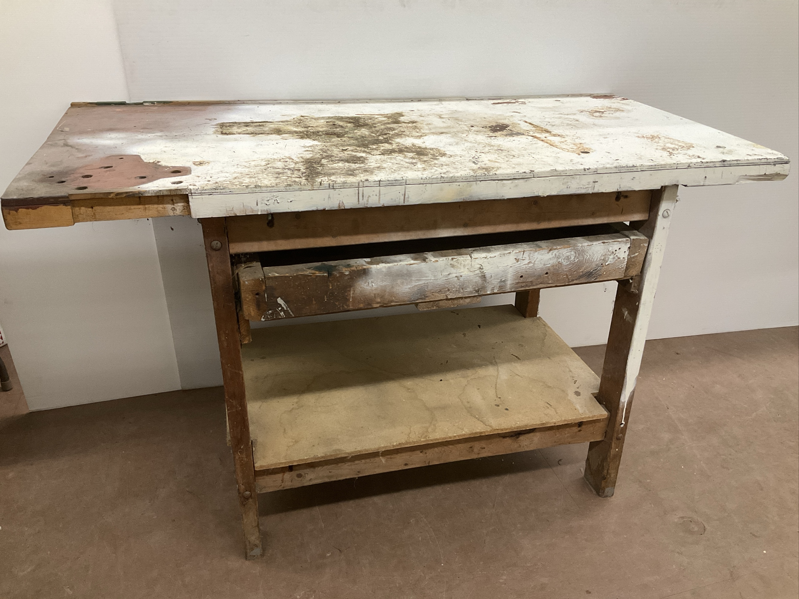 This is a used wooden workbench table featuring a single drawer and a shelf. It shows signs of wear. Ideal for a workshop or craft area. 37 x 60 x 28.5 in.
