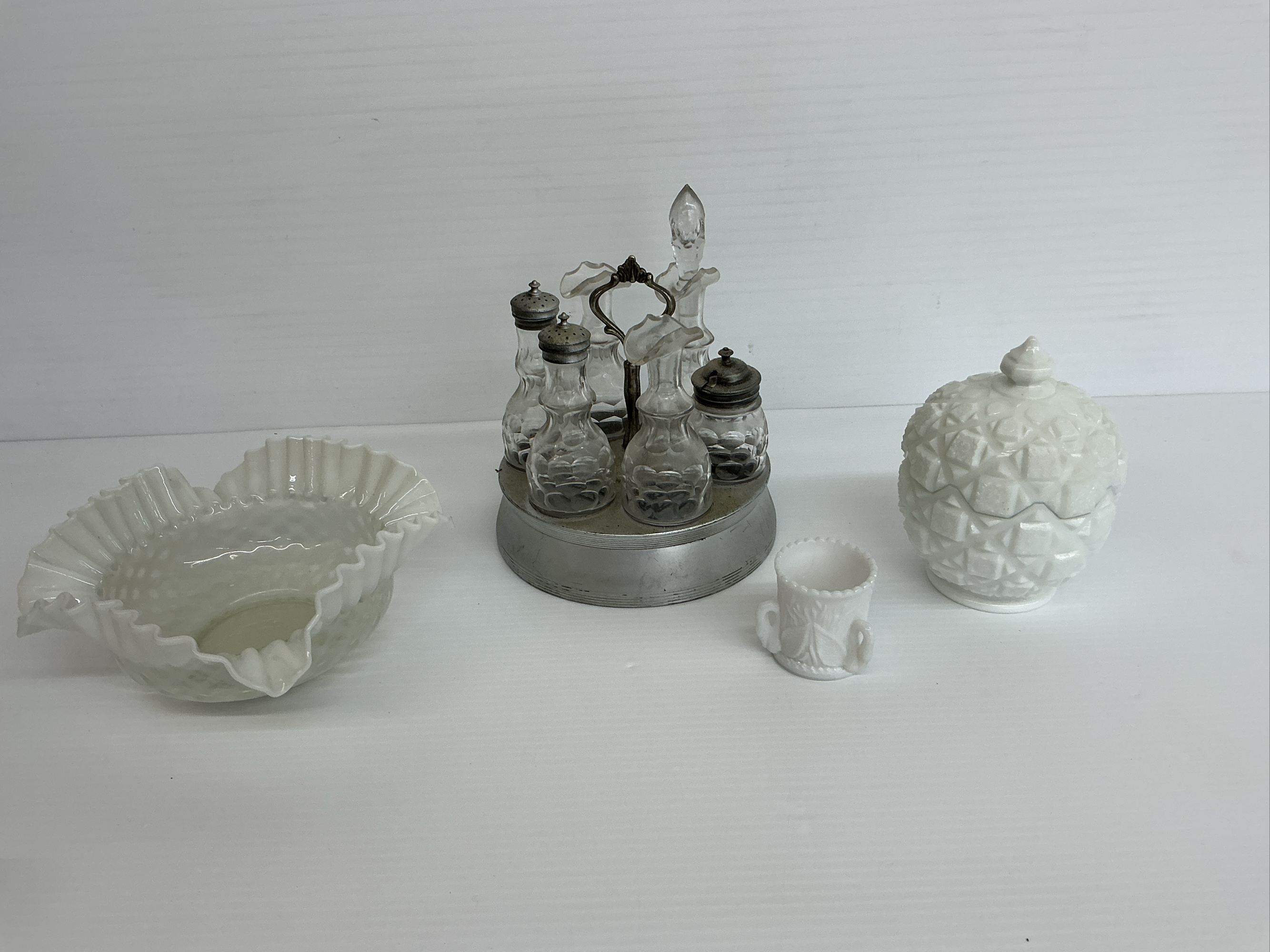 Collection of decorative glassware including a condiment set with metal rack, a milk glass ruffled edge bowl, a Westmoreland "old quilt" pattern candy jar with lid, and a Westmoreland swan design toothpick holder. Bowl 4 x 7 in.