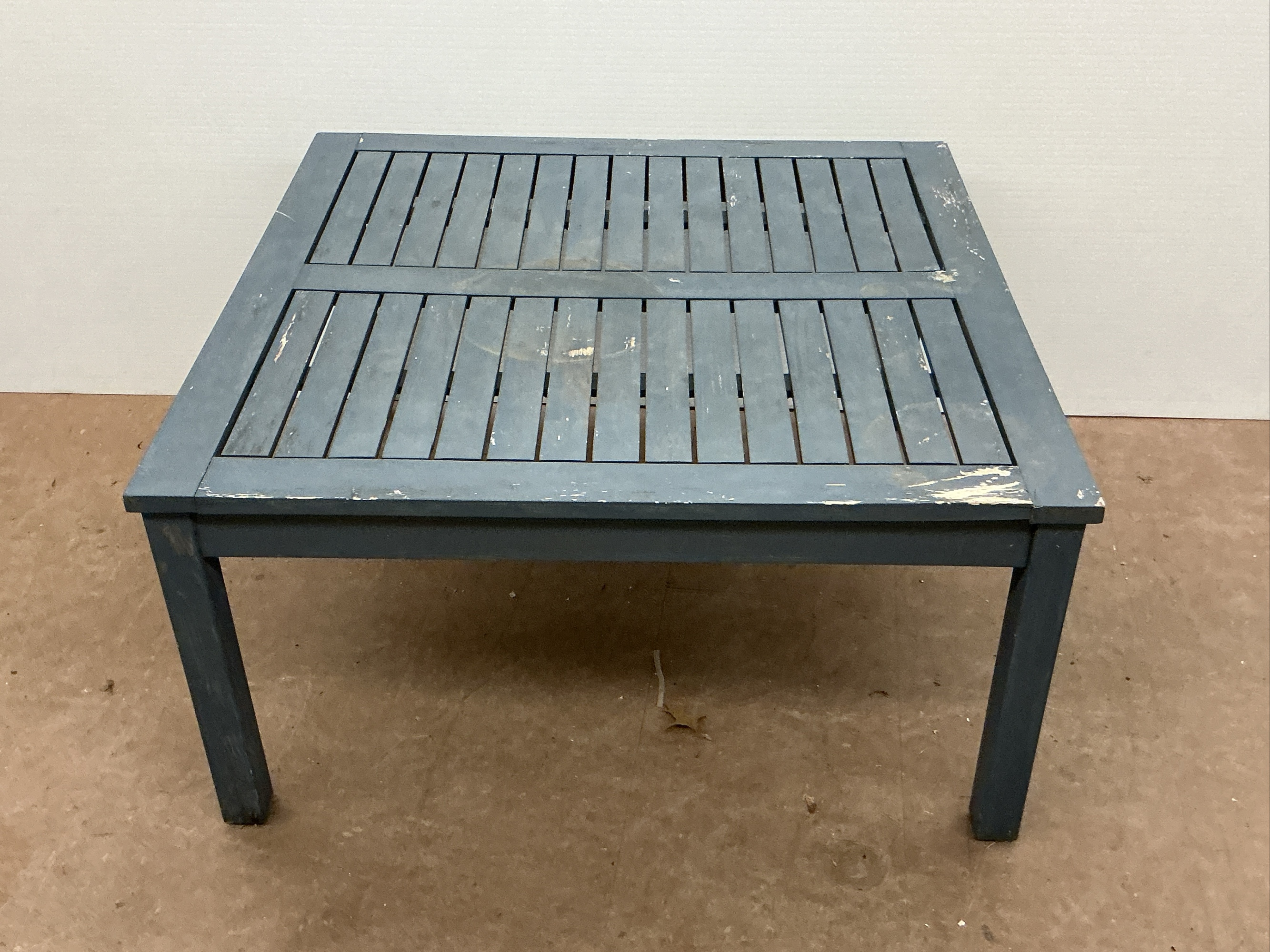Square outdoor coffee table with a wooden slat top and legs. Perfect for a patio or deck. 18 x 35 in.