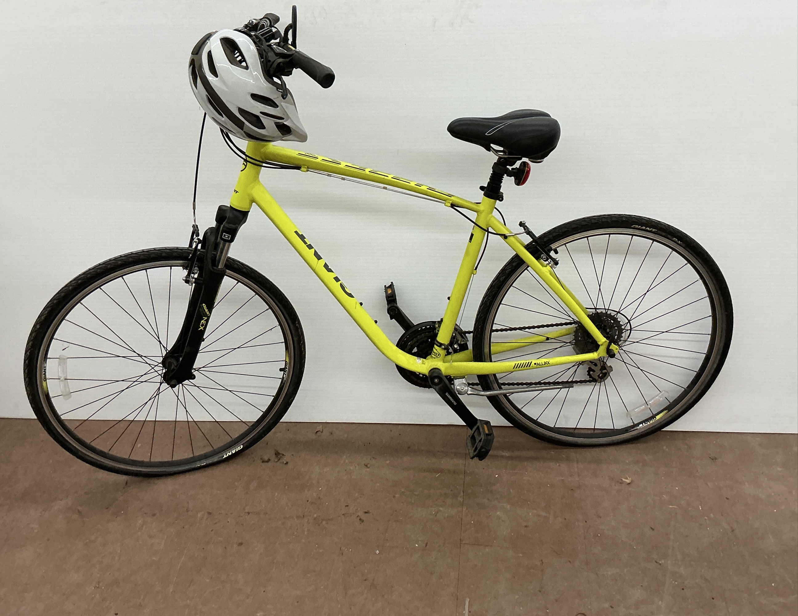 This auction features a Giant Allux bicycle. It is a yellow color and has a helmet included. It has Giant tires and Shimano equipment.