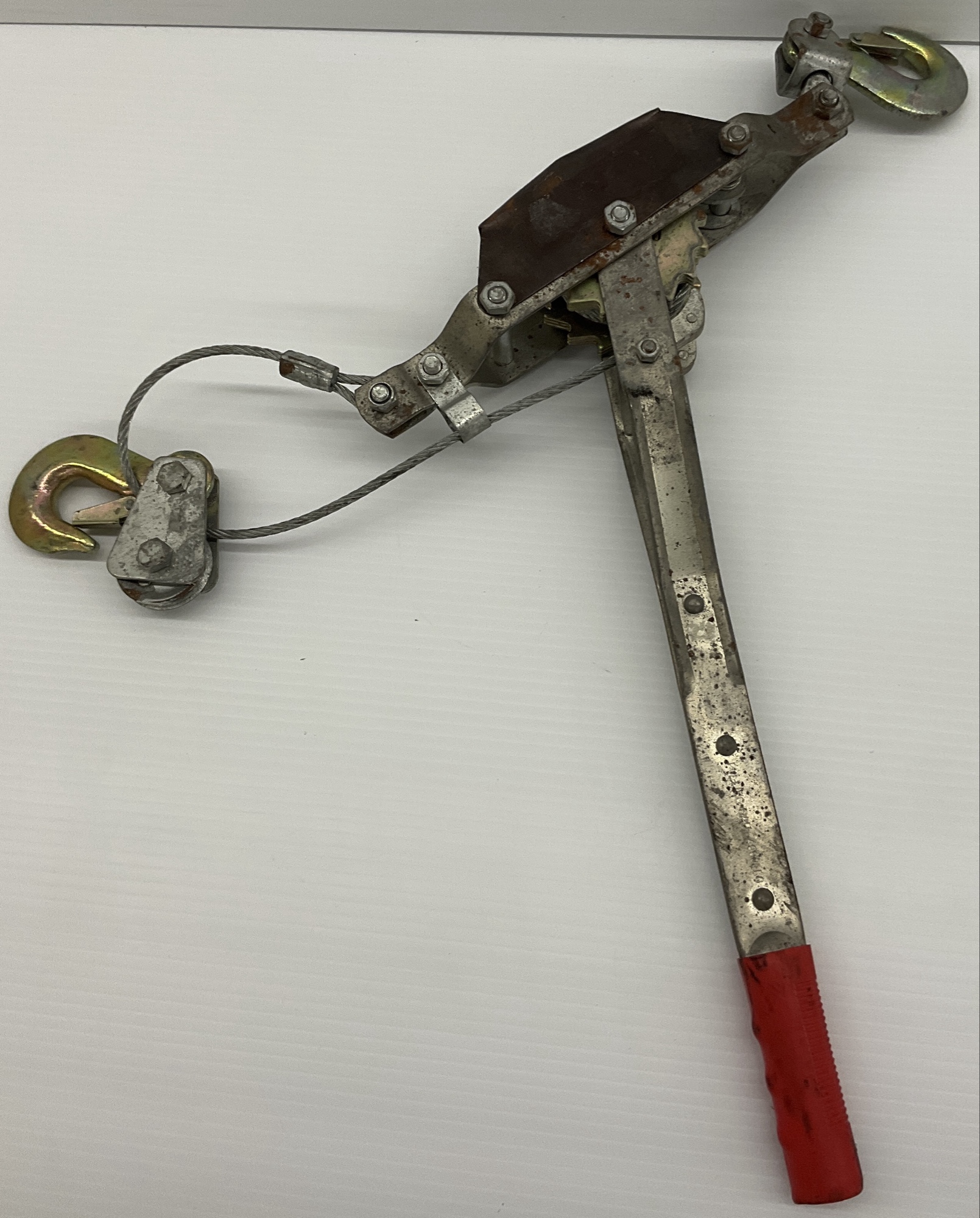 Heavy duty cable come along puller with a 4000 lbs capacity. Features a steel cable, hooks and pulley block for a secure grip.