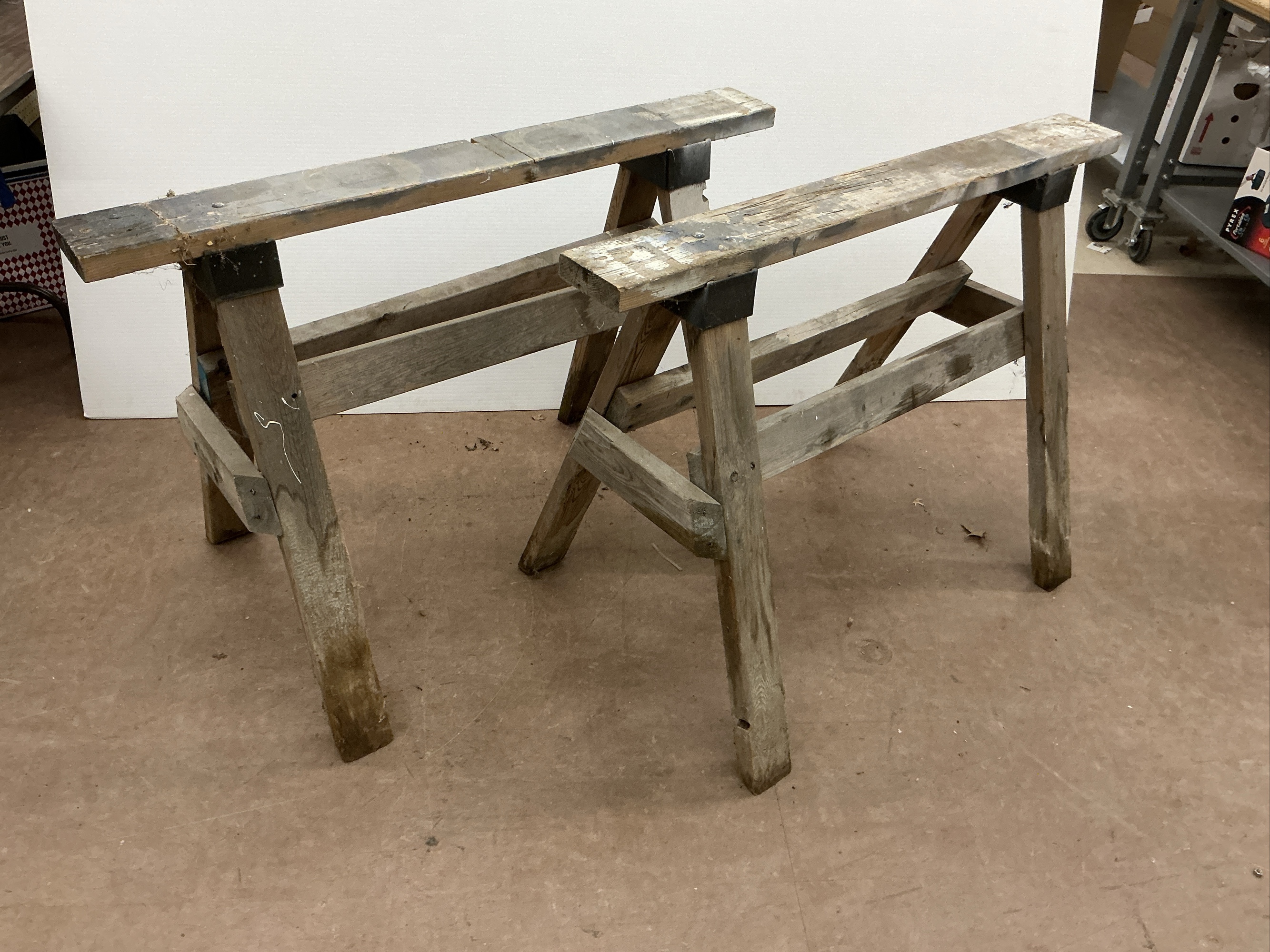 You are bidding on a pair of wooden saw horses. Perfect for your next project, these sturdy sawhorses will provide a solid foundation for cutting and building. 34 x 48 x 28 in.