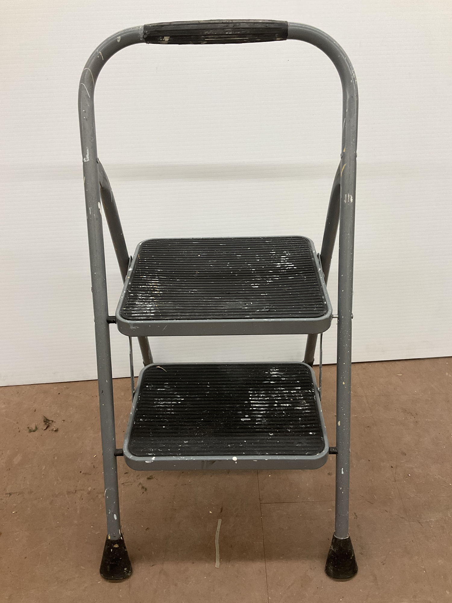 Gray two step ladder. This ladder has rubber footing and a handle at the top. Lot Number L-3700.