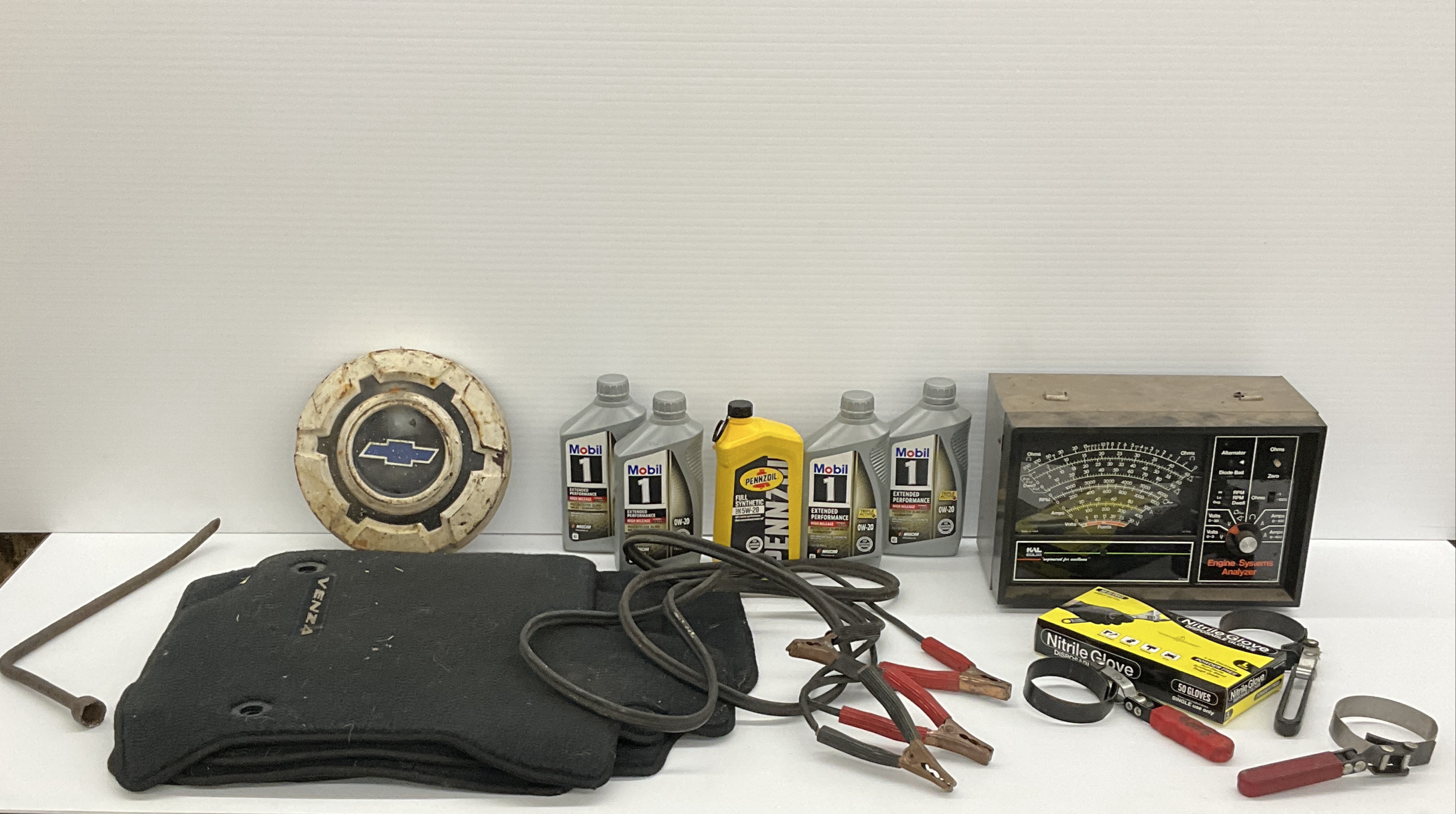 Assortment of automotive related items. Includes a KAL Engine Systems Analyzer, Chevrolet hubcap with tire iron, a set of Venza car floor mats, jumper cables, oil filter wrenches, disposable gloves and an assortment of motor oil.