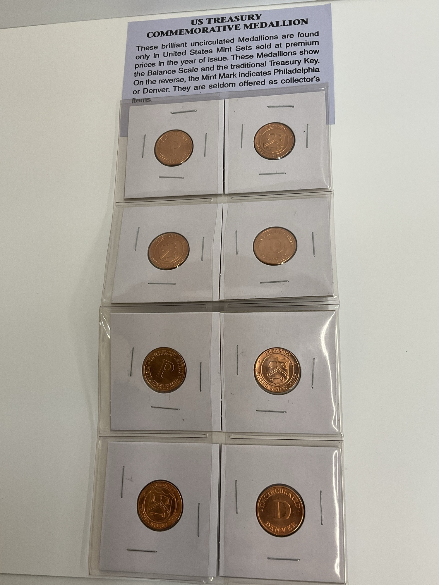 Collection of U.S. Treasury Commemorative Medallions. These brilliant uncirculated Medallions show the Balance Scale and the Traditional Treasury Key. Each Medallion features either the 'P' Mint Mark indicating Philadelphia or 'D' Mint Mark indicating Denver.