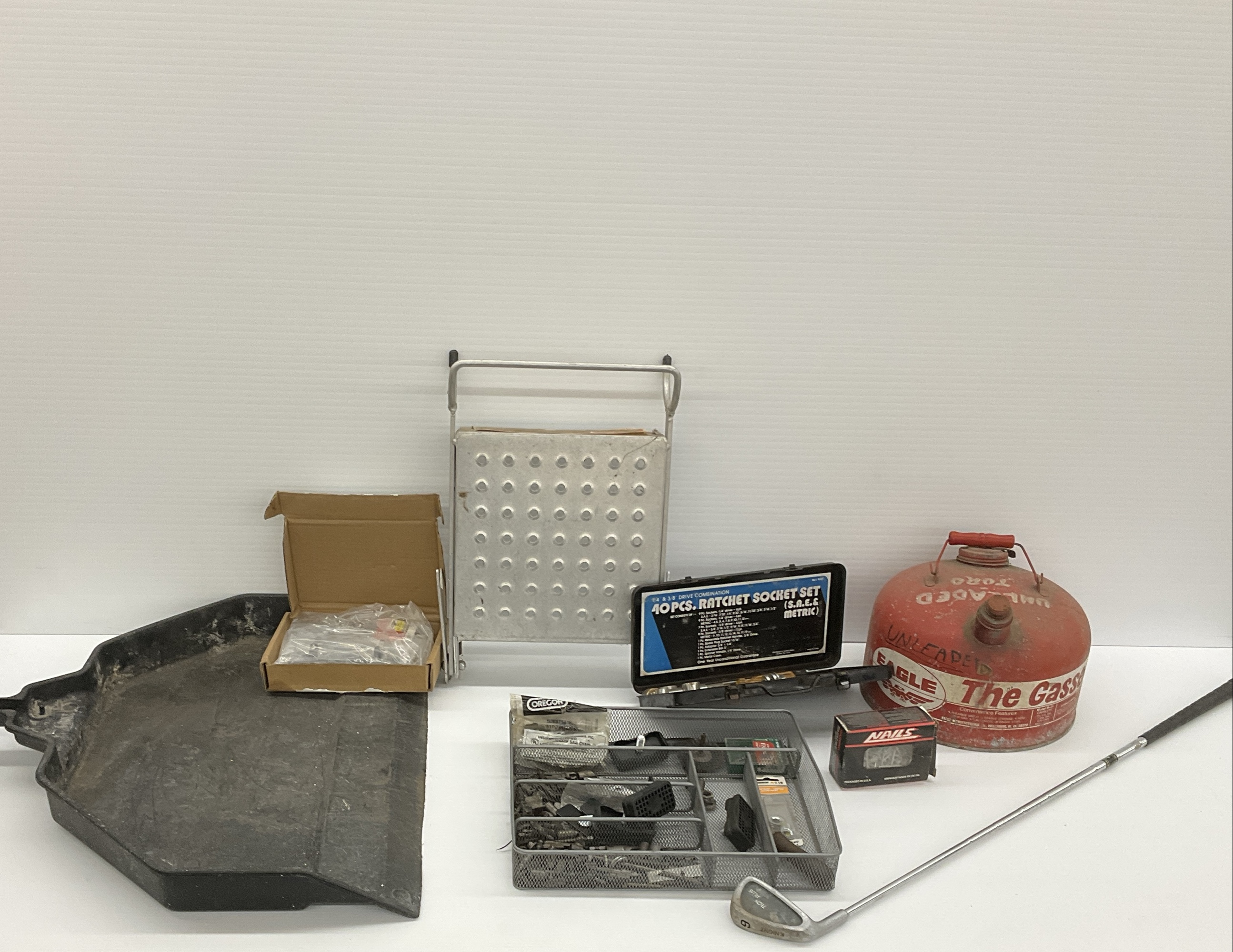 This lot includes a Little Giant Ladder Work Platform Model 10104, a partial Ratchet Socket Set, a Knight golf club, screws, nails and various other items as shown in the photos.