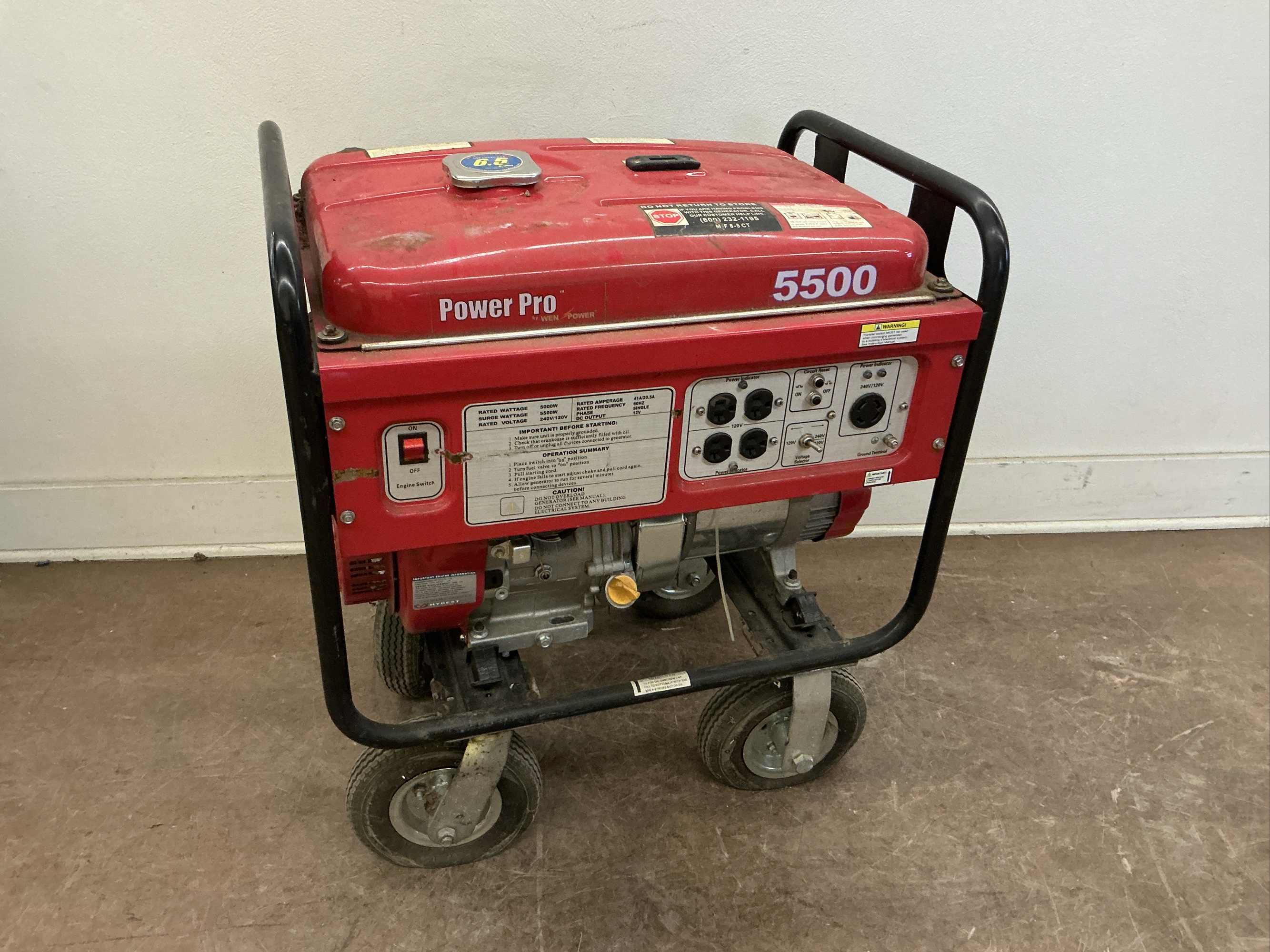 Red Power Pro portable generator with 5500 watts. Great for powering tools, appliances, or providing emergency backup power. Has multiple outlets. Runs on gasoline. 30 x 27 x 20 in.