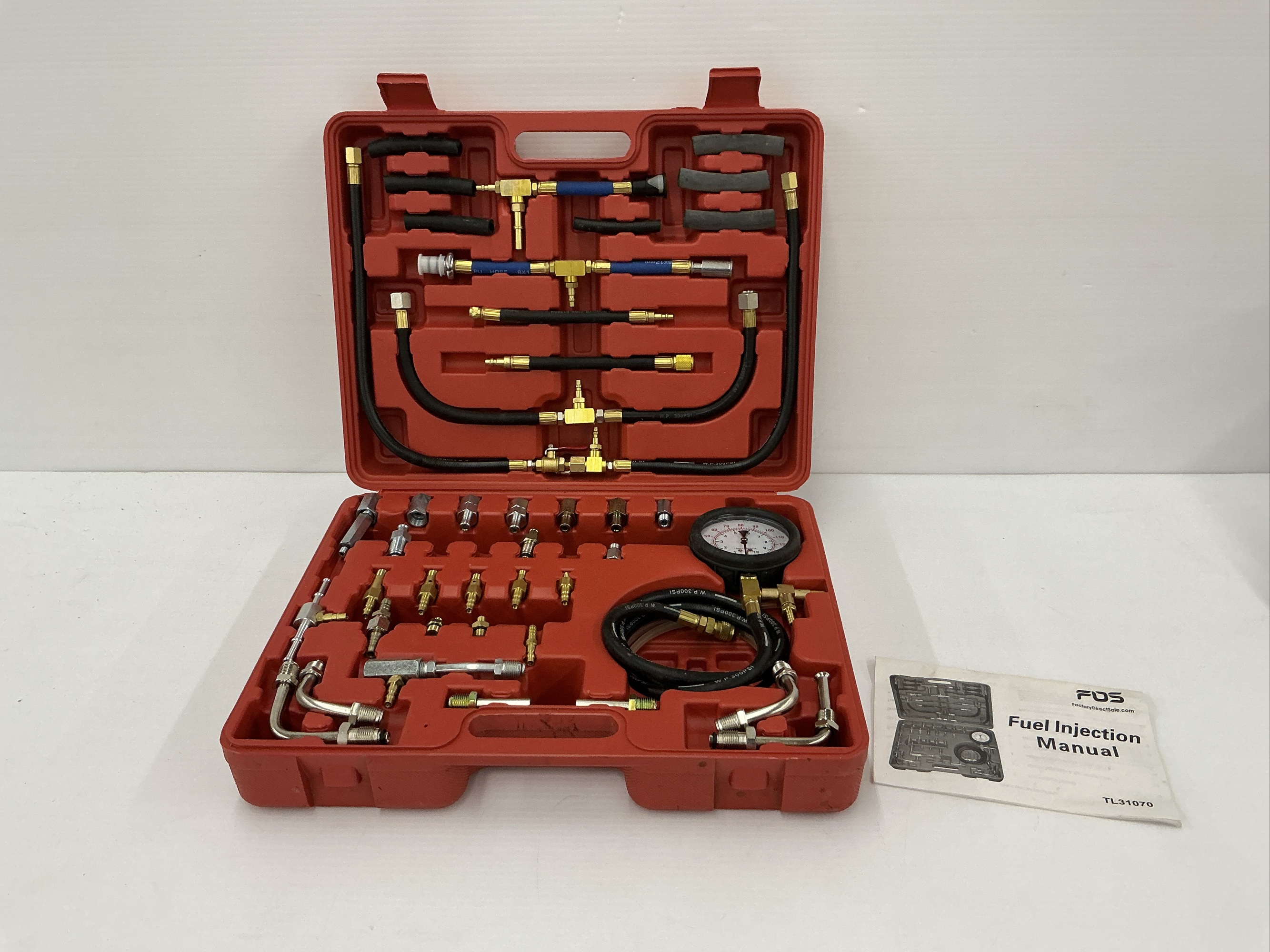 This auction is for a fuel injection system pressure tester kit in a red carrying case. The kit includes various fittings, hoses, and a pressure gauge. A fuel injection manual is also included. Please see photos for details.