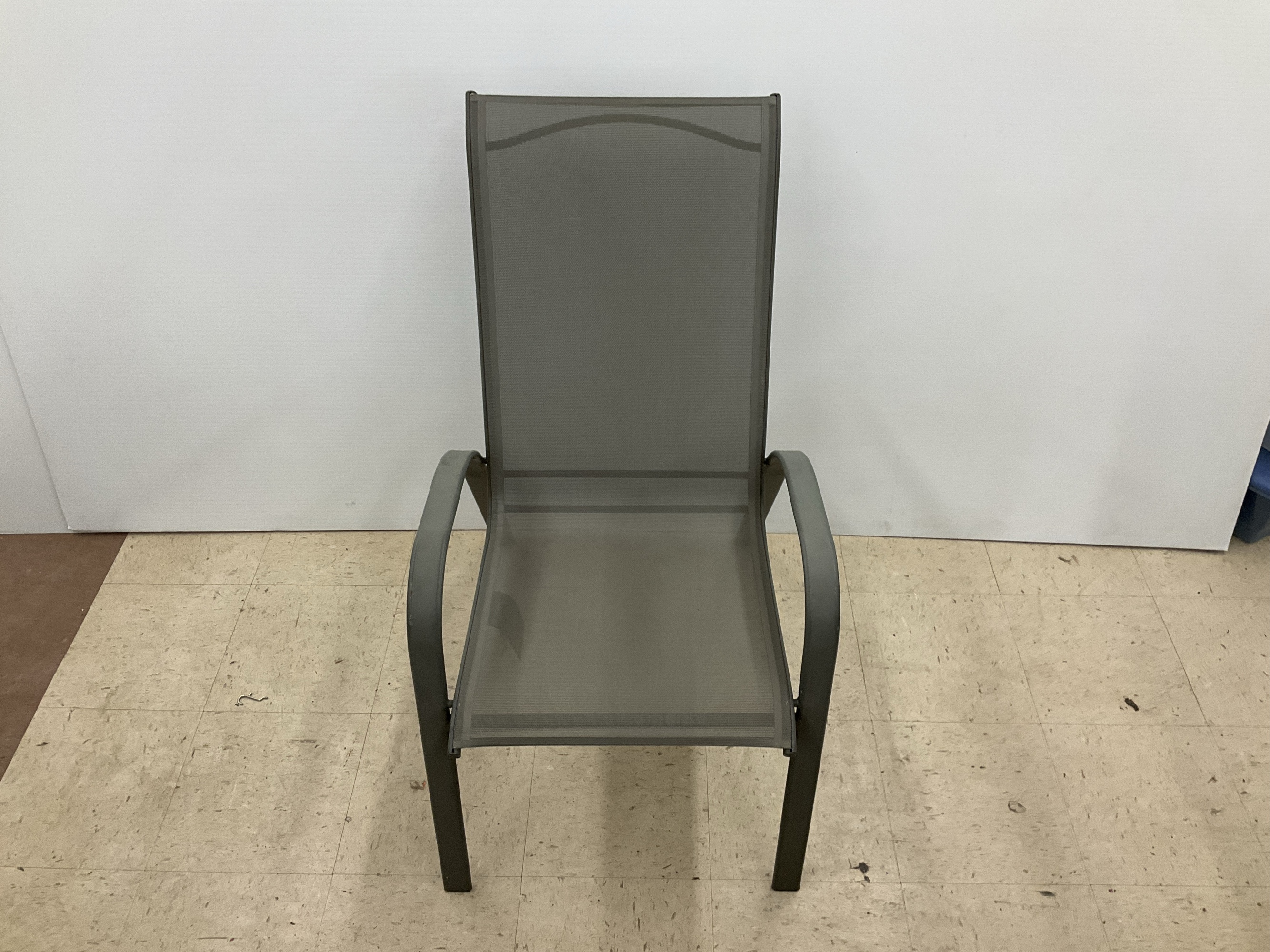 This listing is for a single gray outdoor patio chair. The chair features a mesh seat and back, metal frame, and armrests. Perfect for relaxing on your patio or deck. 39 x 22 x 30 in.