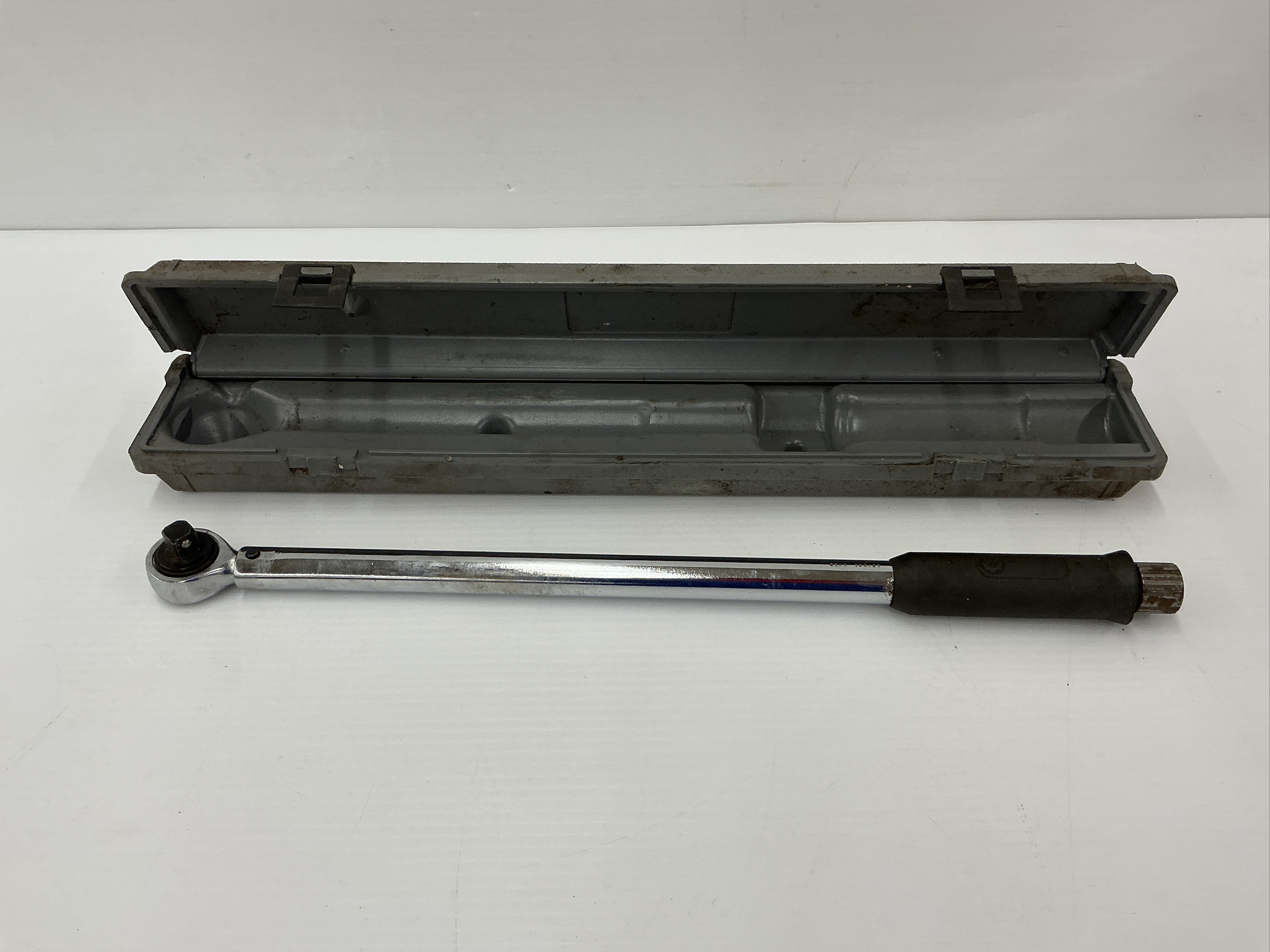 This auction includes a torque wrench and its storage case. The wrench measures in foot pounds, torques, and newton meters.