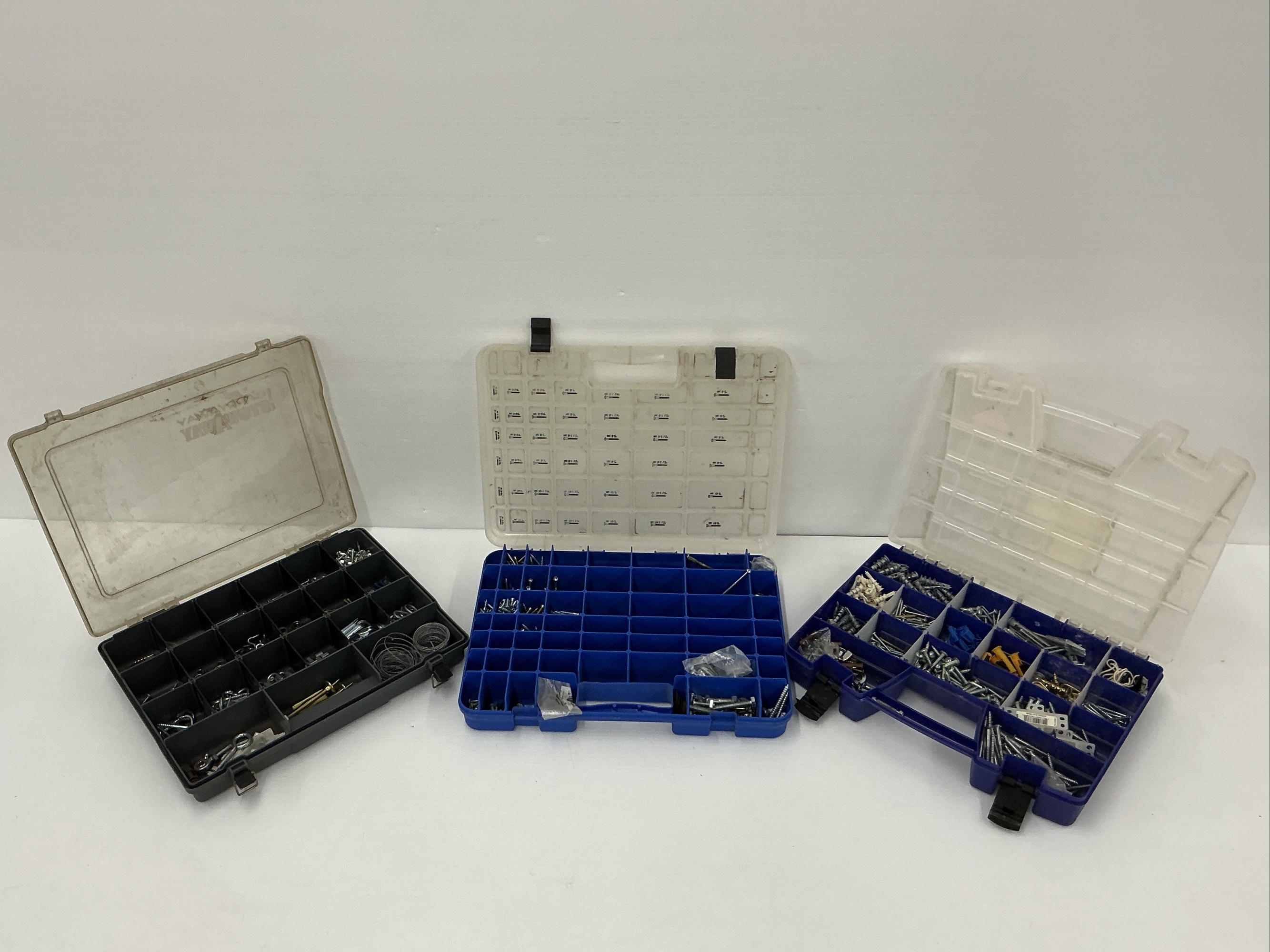 This listing includes three organizer cases filled with a variety of fasteners. You'll find an assortment of screws, wall anchors, nuts, bolts, and other hardware. Great for any workshop or home improvement project.