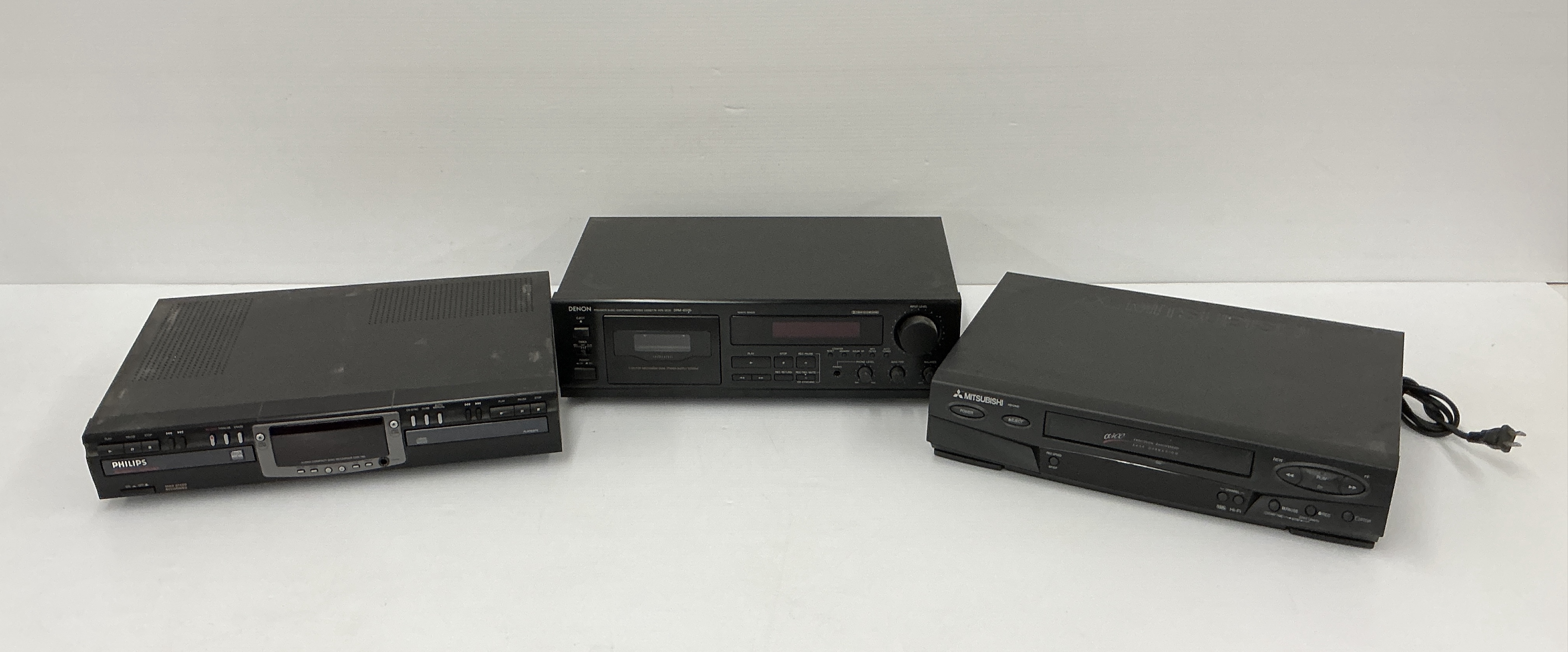 Audio Equipment Lot: Philips CD Recorder, Denon Cassette Deck, Mitsubishi VCR, power on