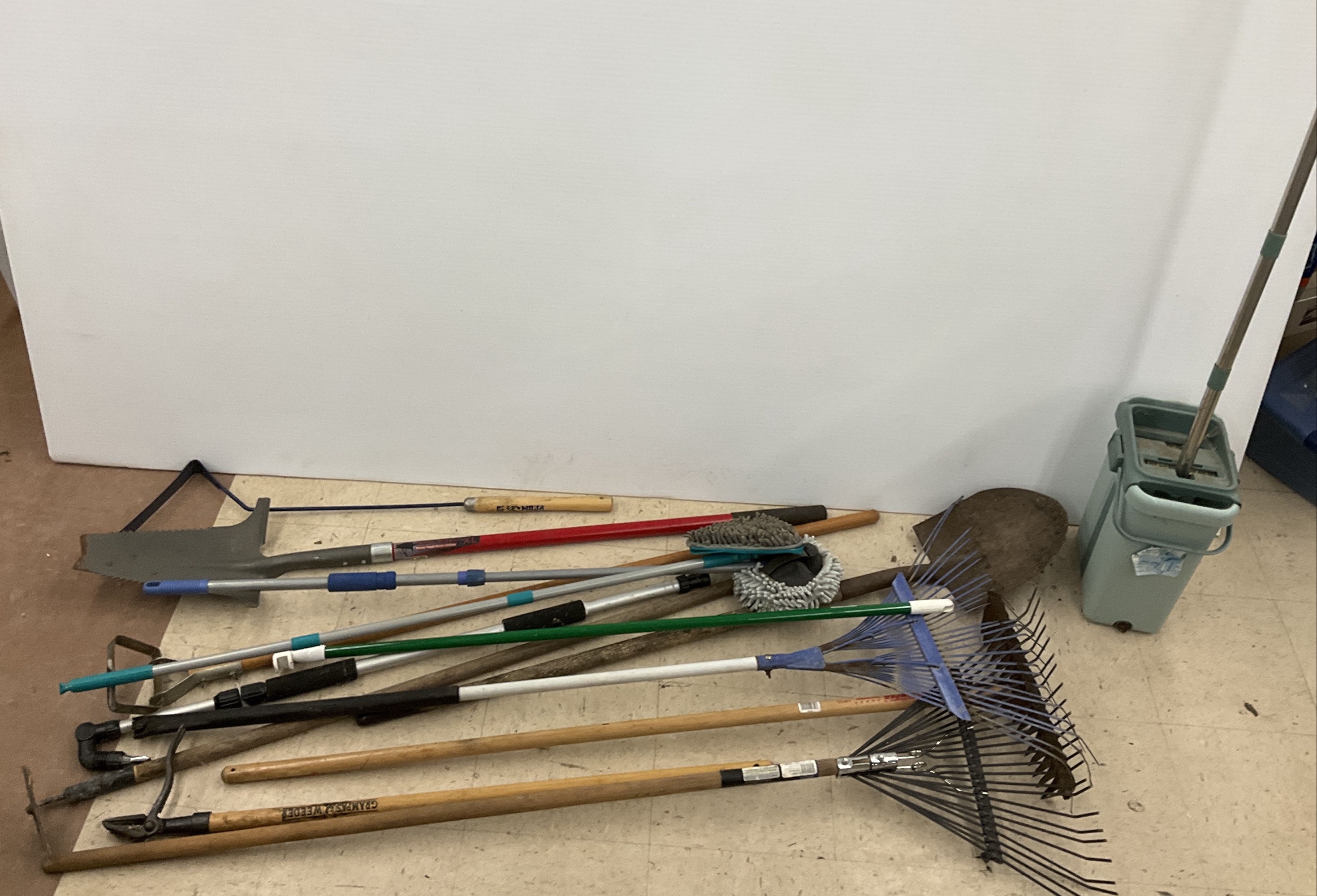 Includes multiple mops, mop bucket, shovels, rakes and various gardening tools.