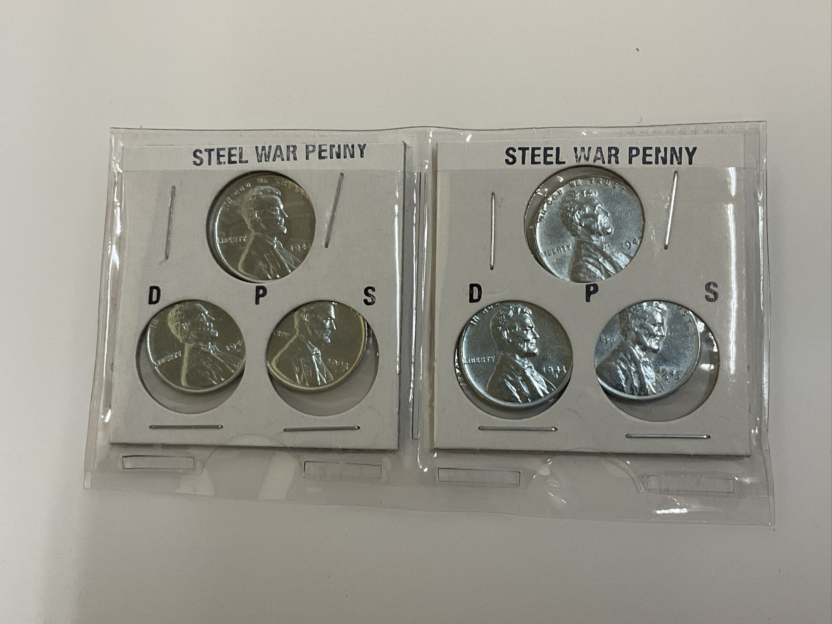 This auction includes two sets of 1943 Steel War Pennies. Each set includes a penny from the Denver (D), Philadelphia (P), and San Francisco (S) mints. A great addition for any coin collector!
