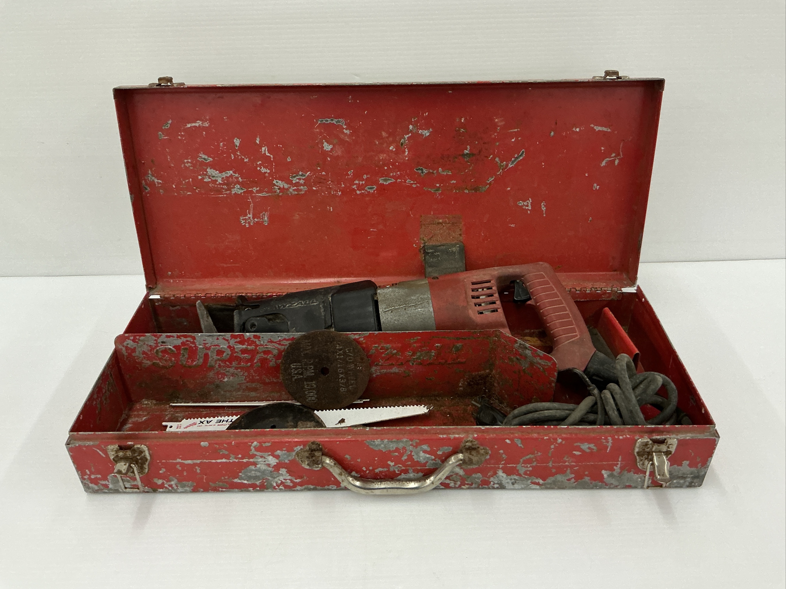 Includes a Milwaukee Sawzall reciprocating saw, metal carrying case, and several blades and accessories.
