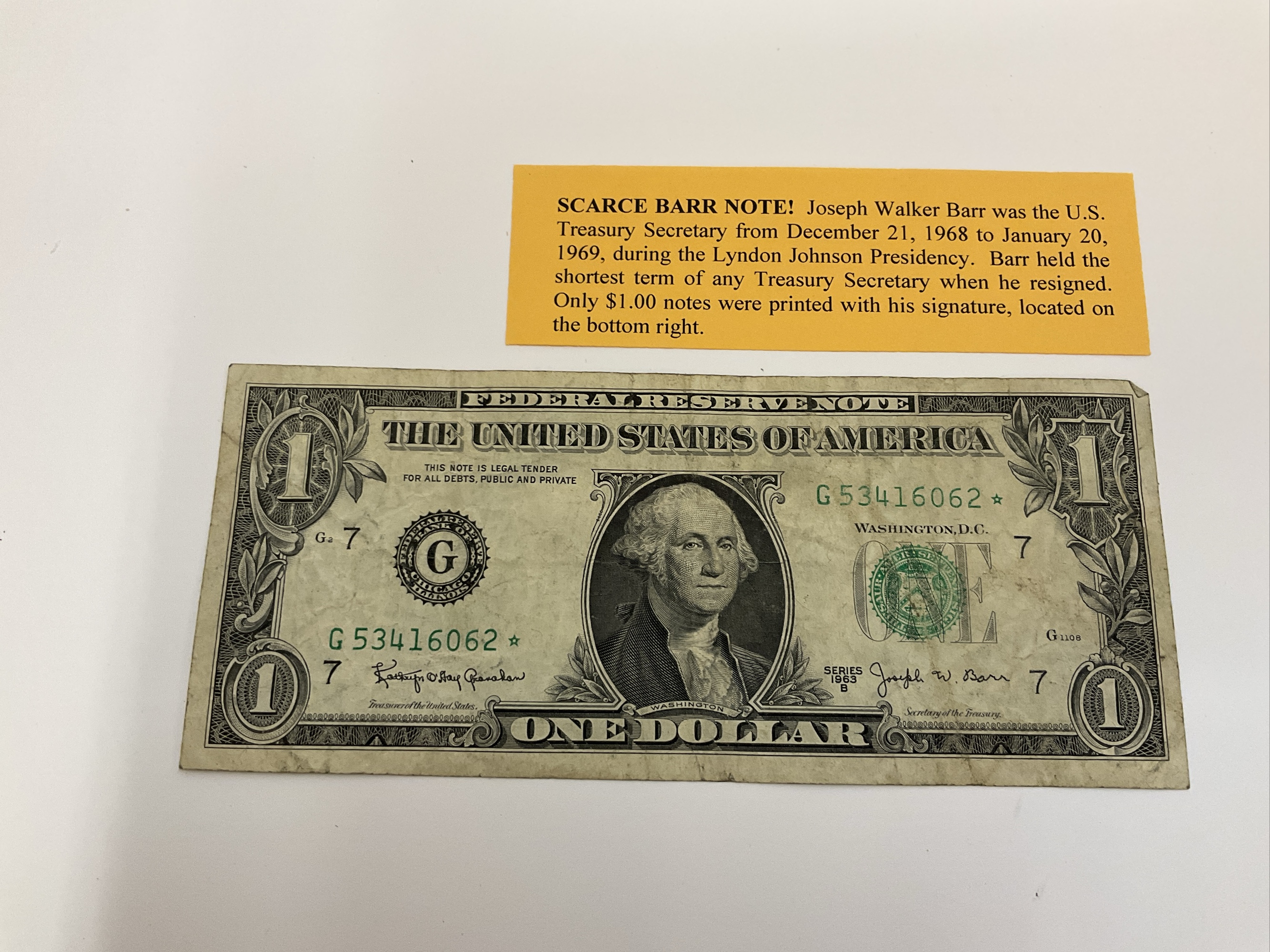 Scarce Joseph Walker Barr $1 note. Barr was the U.S. Treasury Secretary from December 21, 1968 to January 20, 1969, during the Lyndon Johnson Presidency. Barr held the shortest term of any Treasury Secretary when he resigned. Only $1.00 notes were printed with his signature, located on the bottom right.