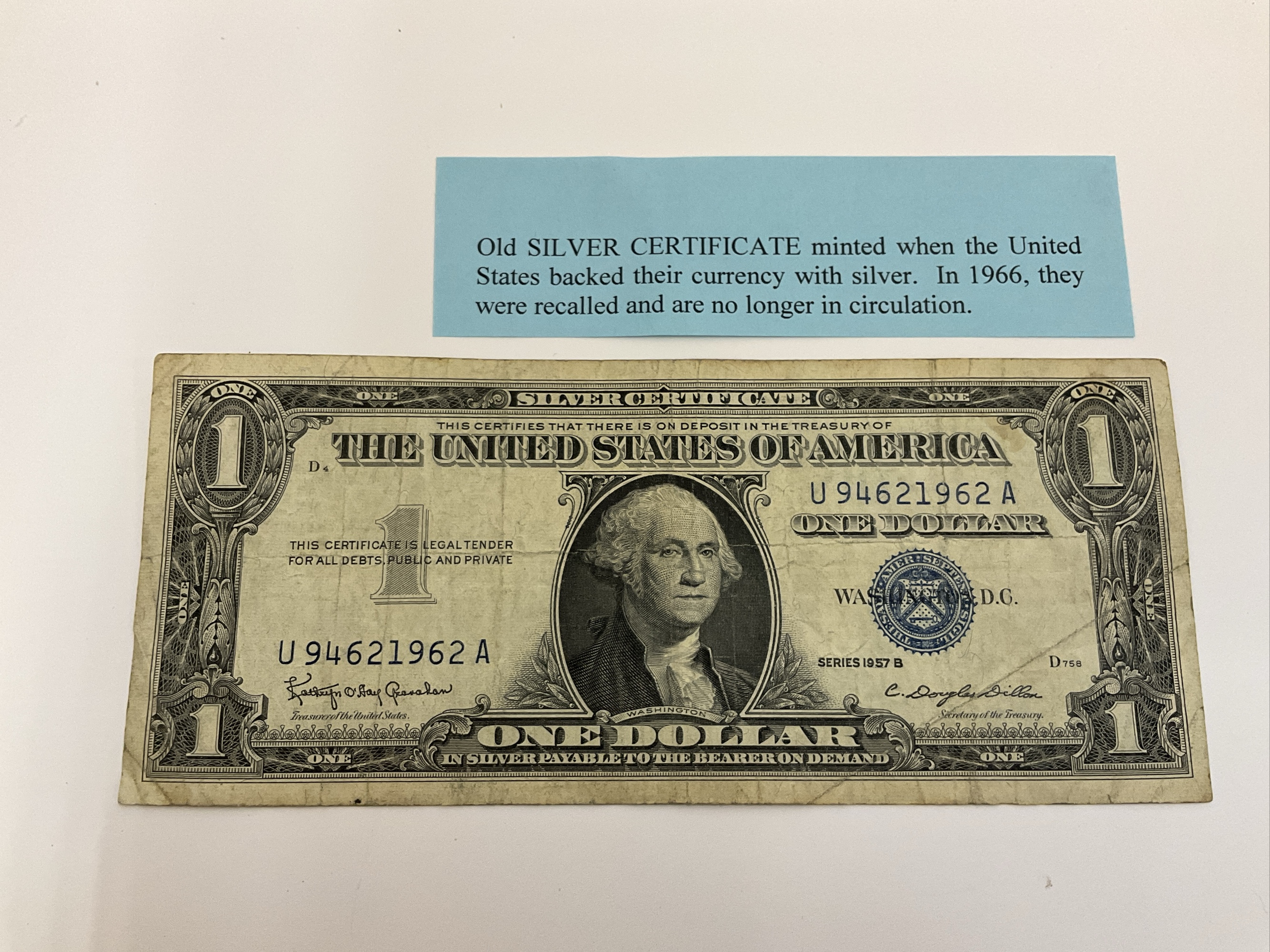 Old Silver Certificate one dollar bill. These bills were minted when the United States backed their currency with silver. In 1966, they were recalled and are no longer in circulation.