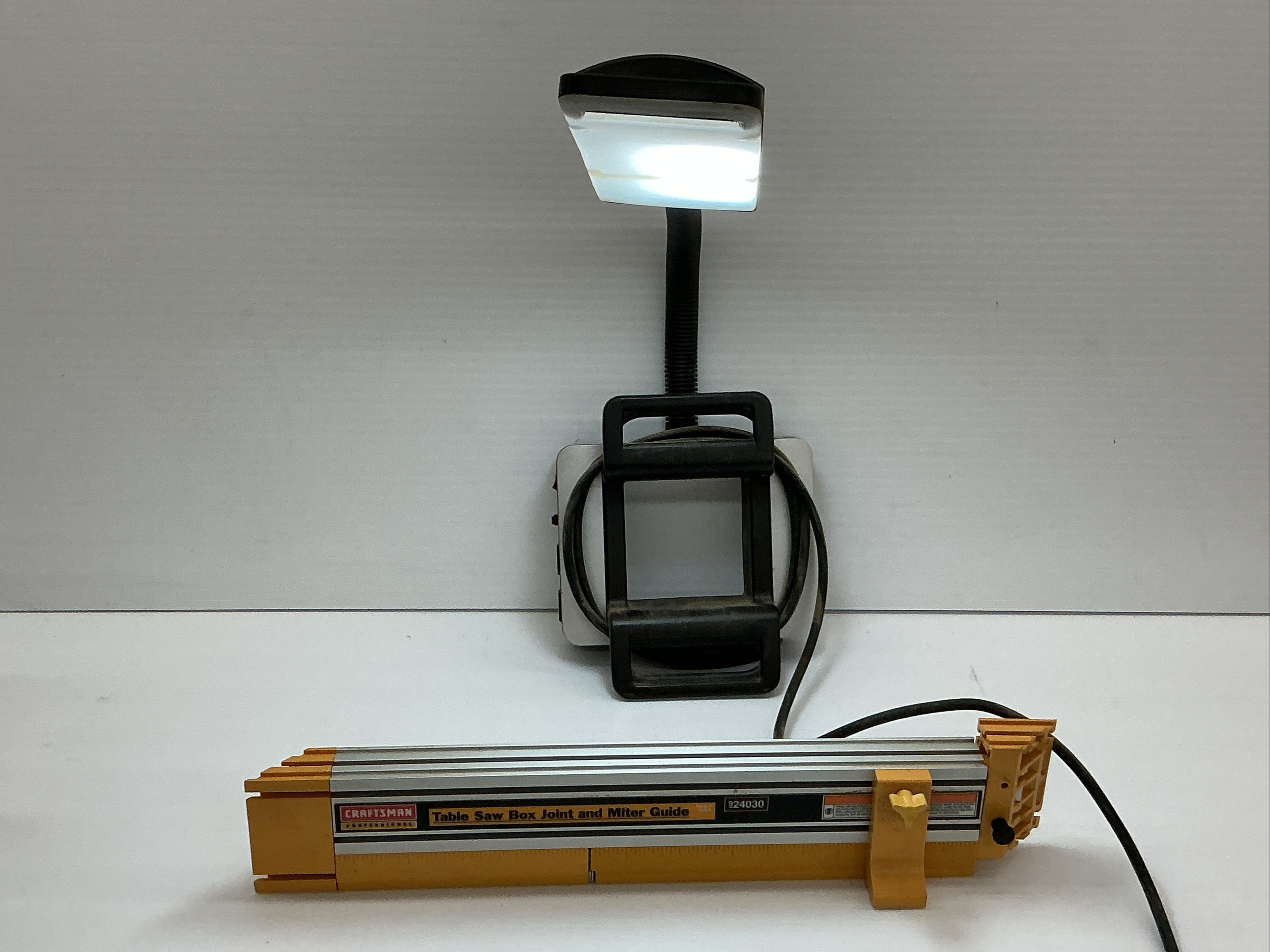 This listing features a Craftsman table saw box joint and miter guide, accompanied by a flexible Craftsman LED worklight, and a power strip.