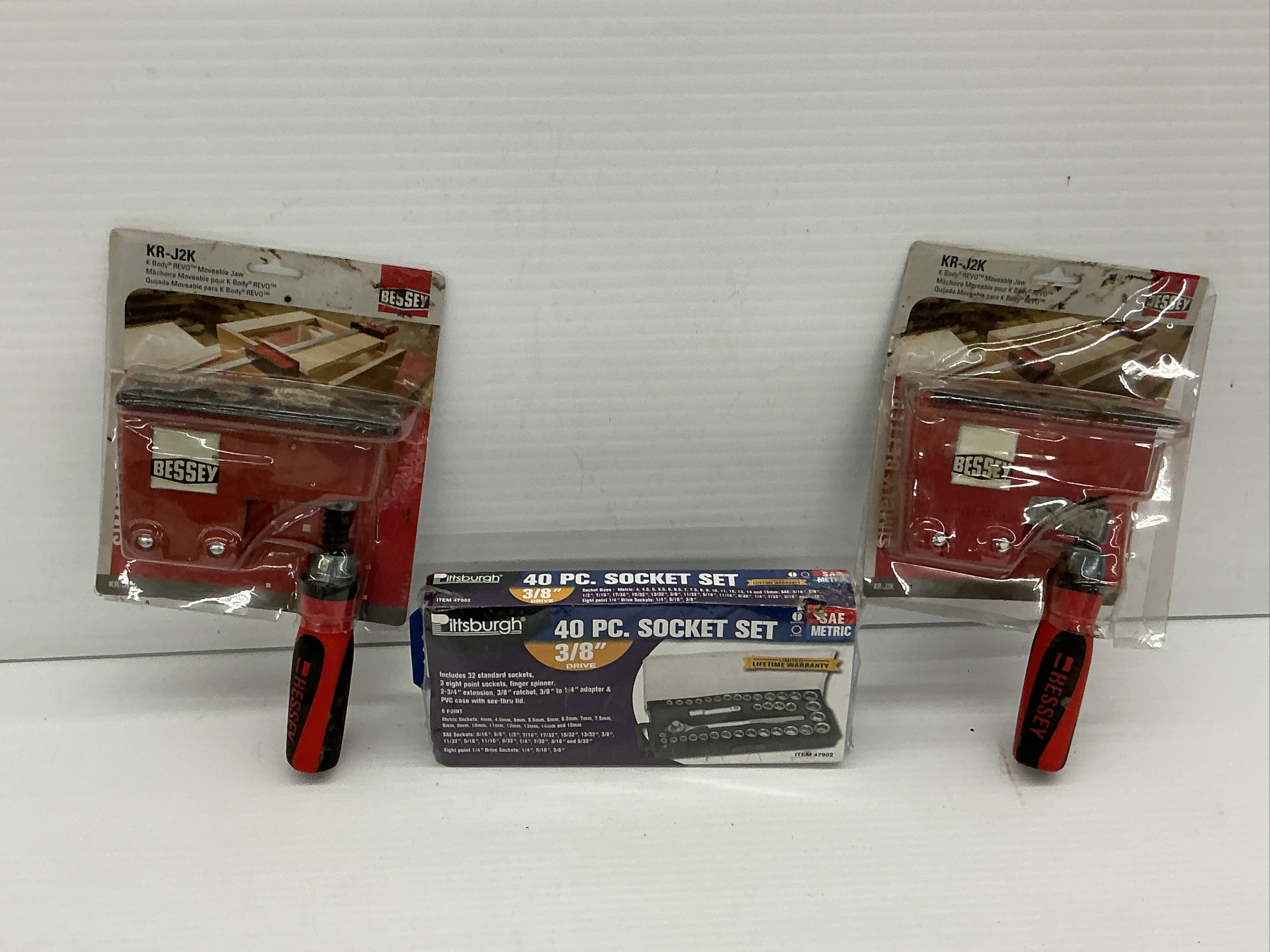 This lot includes two new Bessey K Body Revo Movable Jaws and a Pittsburgh 40 piece socket set. The socket set is a 3/8" drive set with both SAE and Metric sockets.